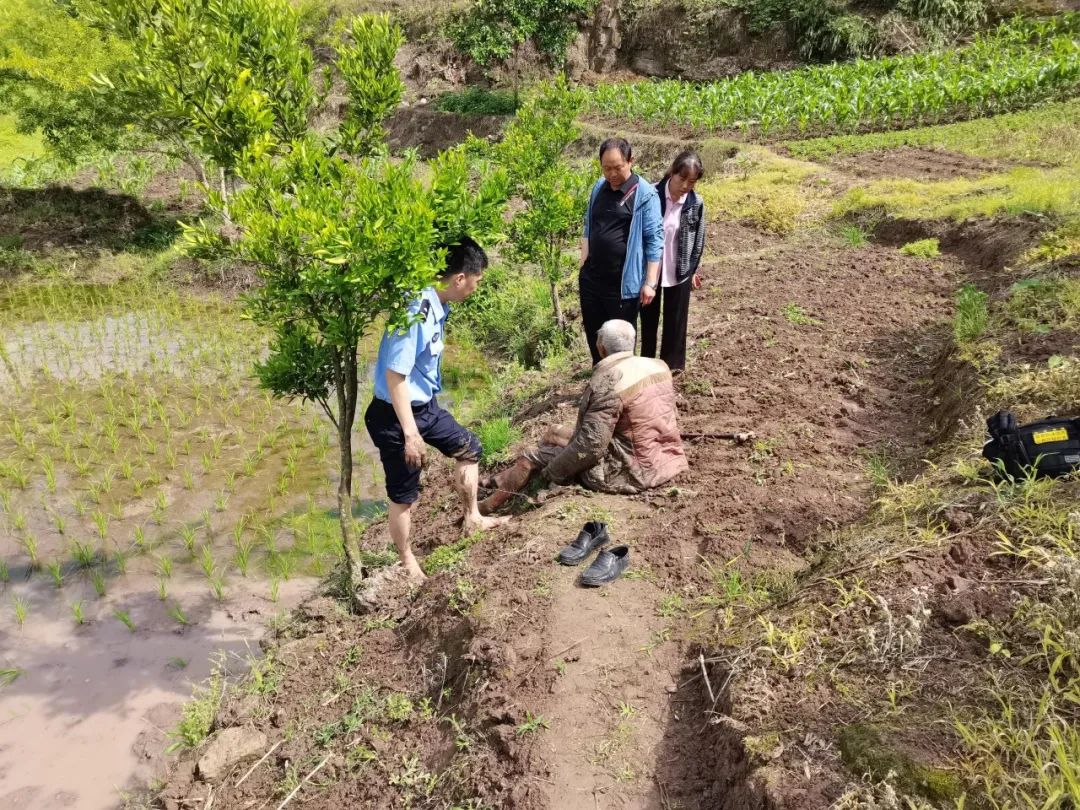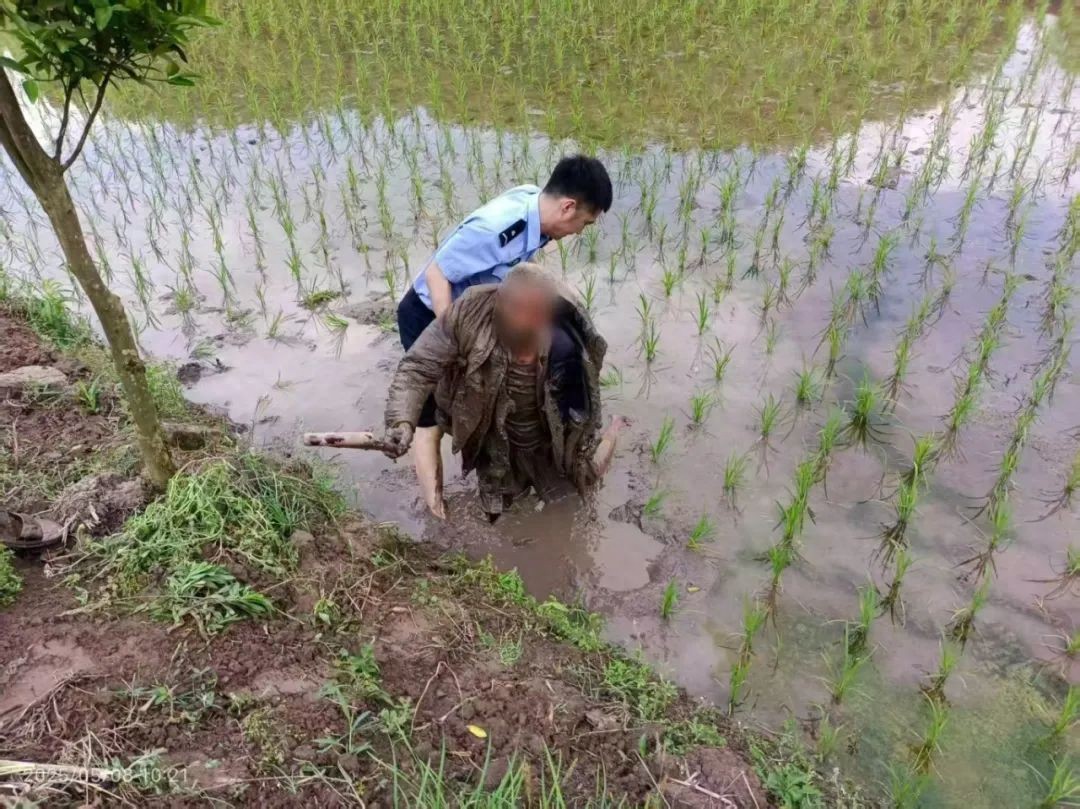 2025年5月8日10时许,蓬溪县公安局常乐派出所接到群众报警,称常乐镇某村有一位老人不慎摔倒在秧田中请民警帮助。
