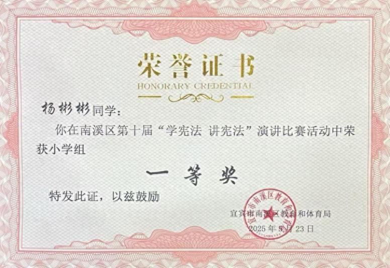 2025年5月23日,热烈祝贺宜宾市南溪区福临小学校五年级(1)班杨彬彬同学在南溪区“学宪法 讲宪法”演讲比赛中,凭借扎实的宪法知识储备、稳健的台风和极具感染力的精彩演讲,从众多优秀选手中脱颖而出,一举荣获小学组一等奖!