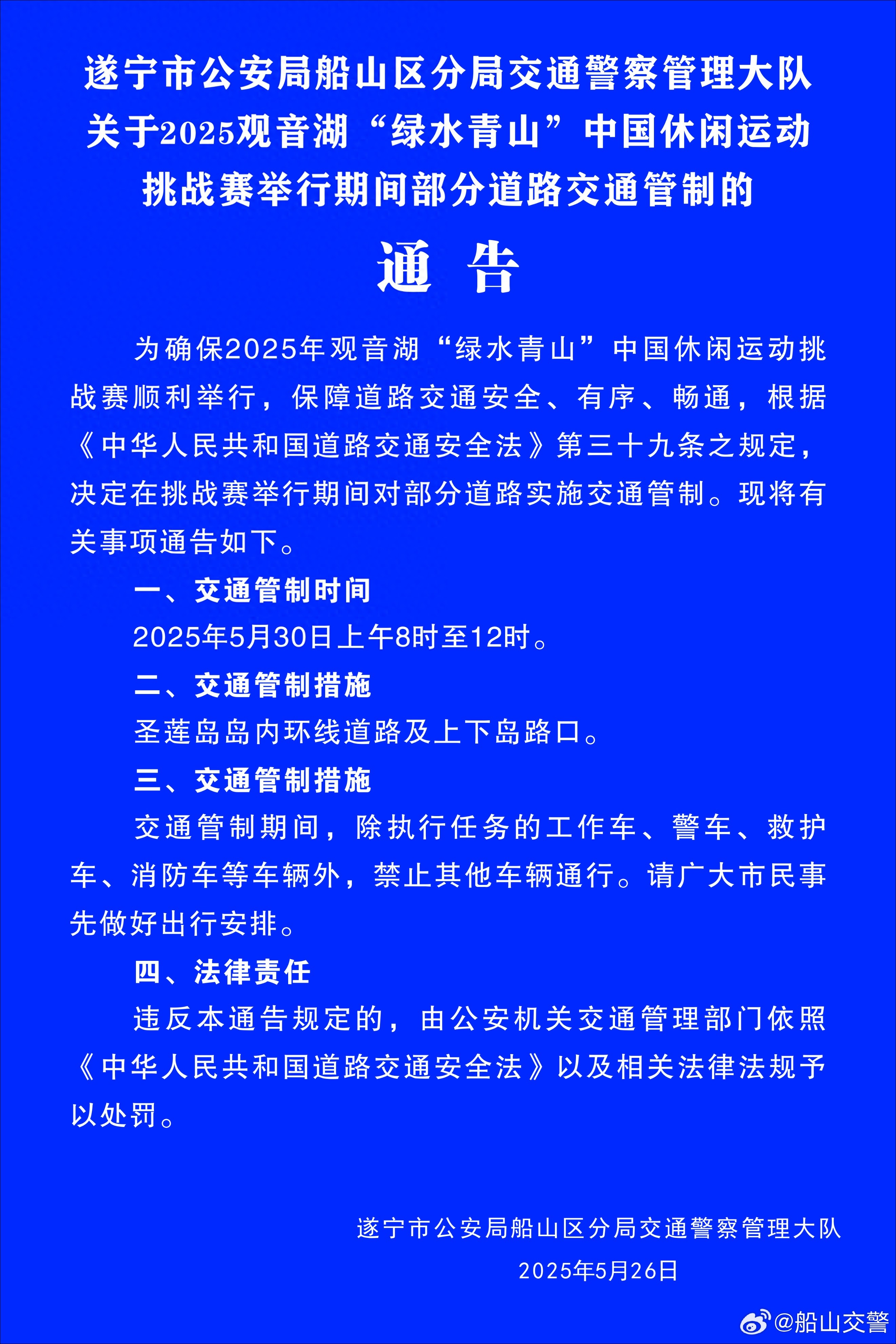 遂宁观音湖“绿水青山”中国休闲运动挑战赛期间部分道路交通管制