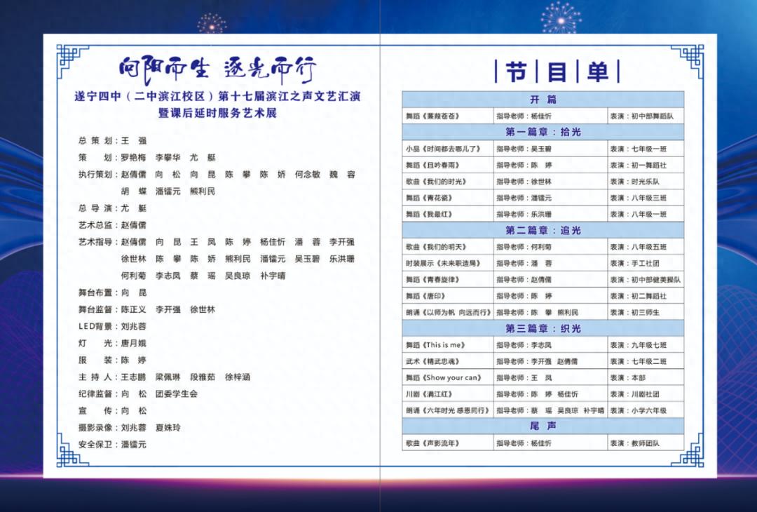为全面落实素质教育,践行“五育并举”教育理念,展现师生艺术风采,营造积极向上、健康文明的校园文化,2025年5月22日晚,遂宁四中(二中滨江校区)第十七届“滨江之声”文艺汇演暨课后延时服务艺术展在学校运动场盛大启幕。