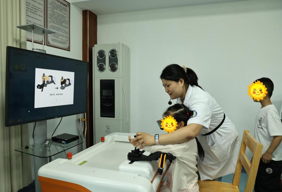 儿童康复中心治疗师丘小晶边指导儿童体验边介绍,“通过游戏化训练模式,让机器辅助肢体障碍儿童完成抓握、伸展等动作,而屏幕上实时反馈的游戏界面会让康复过程变得趣味十足。”