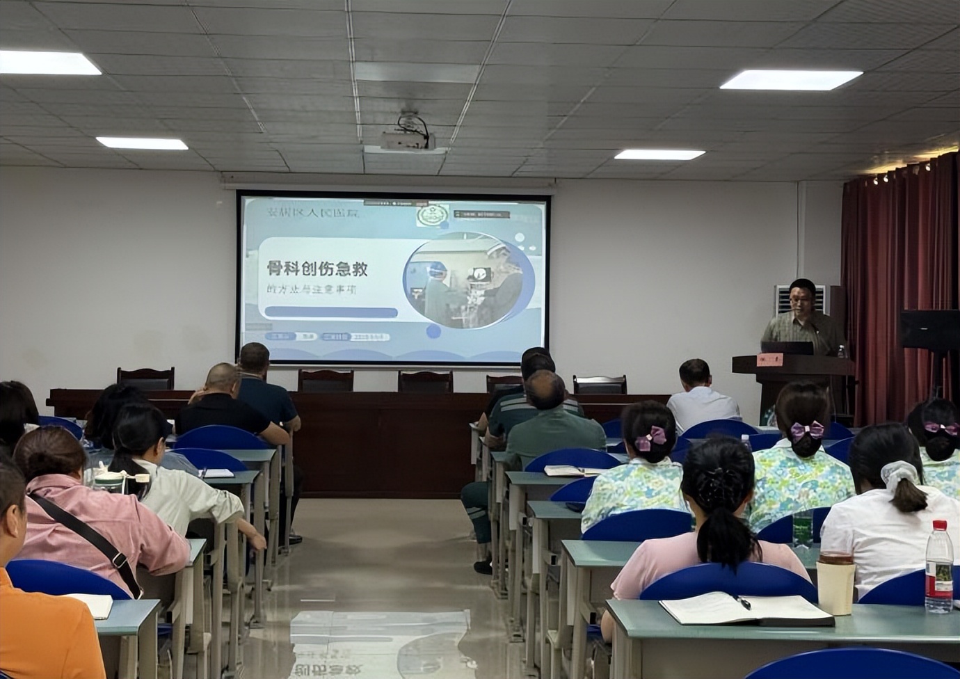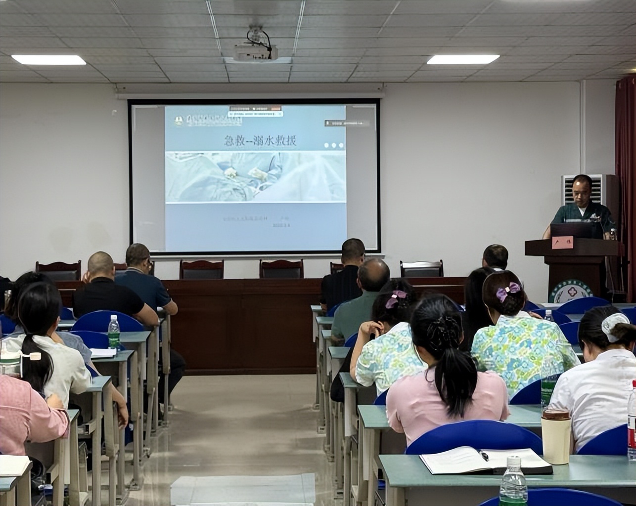 会上,急诊科主治医师刘彪以《救治现场检伤分类技术》;急诊科副主任医师卢伟以《溺水救援》;普外、肛肠、神经、烧伤外科主治医师殷俊以《开放性腹部损伤的应急救治及注意事项》;肝胆、泌尿、胸外科主治医师陈伟以《创伤性血气胸的救治措施》;骨科、创伤、血管外科医师倪虎以《骨科创伤急救的方法与注意事项》进行专题授课。