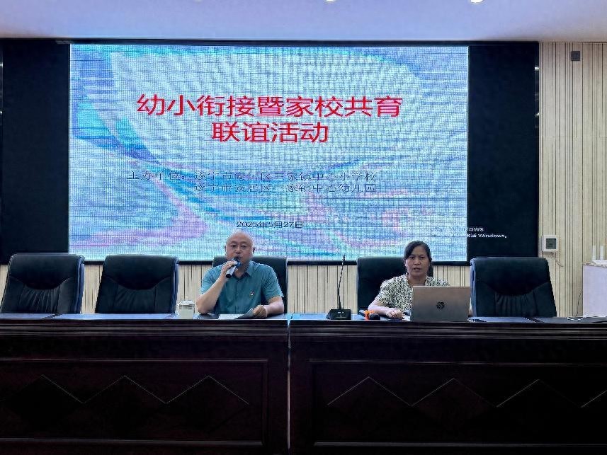 5月27 日,遂宁市安居区三家镇中心小学校迎来了一批特殊的客人——三家镇中心幼儿园大班的小朋友和他们的家长。三家小学高年级的大同学热情地带着客人们参观了小学校园环境、教学楼、食堂、寝室等,幼儿园的小朋友们初步了解了小学、熟悉了小学校园环境;三家小学一年级的小同学还带着大班的小朋友们走进课堂,通过一对一交流的方式,学习起立、问好、整理书包,坐姿、写字姿势、举手姿势等课堂常规,让小朋友感受了小学的课堂学习生活。最后,三家小学的老师向幼儿的家长们分享了如何引导小朋友顺利从幼儿园到小学过渡的衔接方法,达成了家校携手育人的共识。