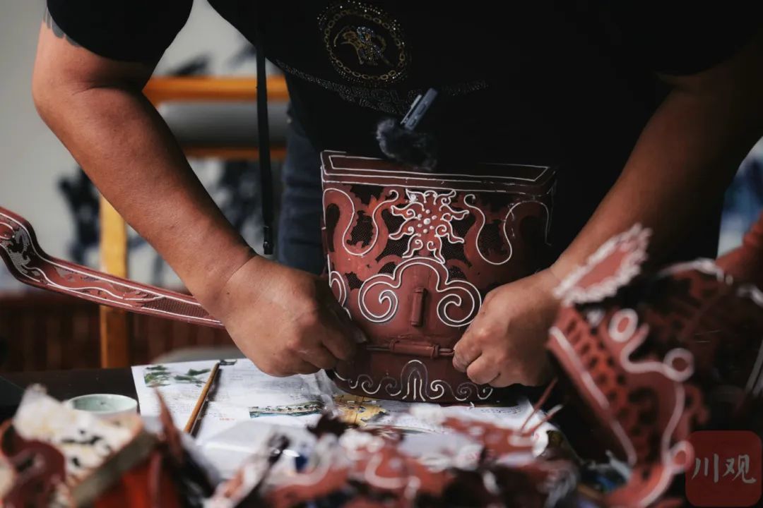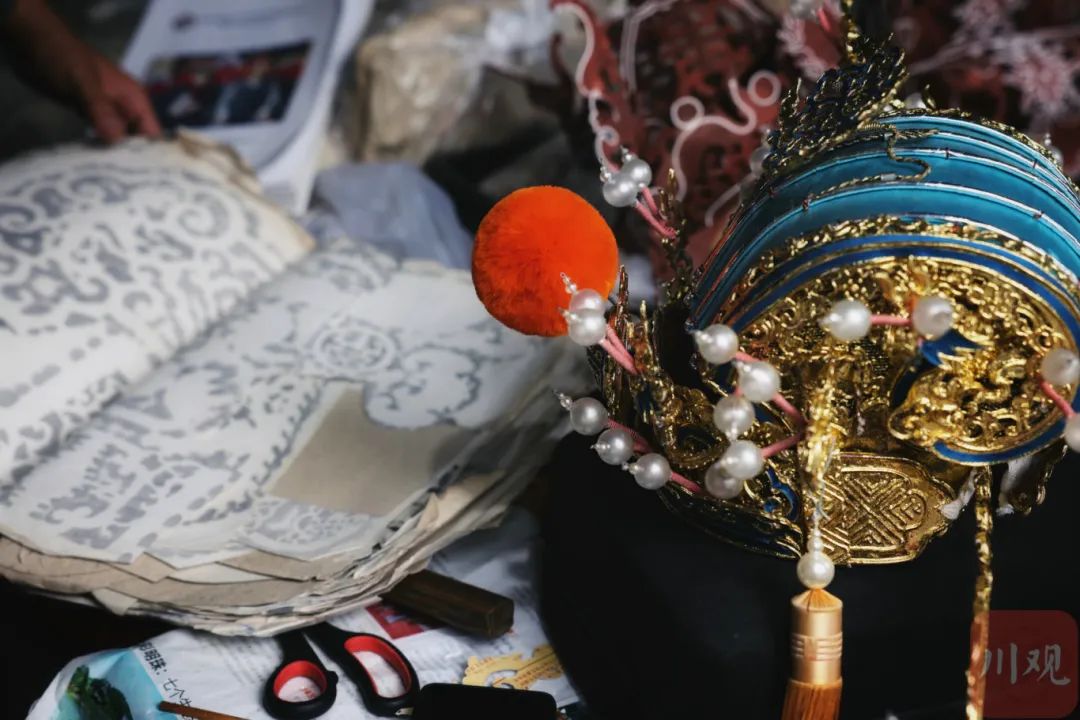 手中握着美工刀,冯侨灵巧地在纸板上勾勒出云龙纹样,半成品的盔头部件与色彩斑斓的绒球、珠串等装饰材料随处可见。在“非遗热”成为潮流的当下,川剧盔头进入大家的视野,冯侨的不少作品受到大家的关注。