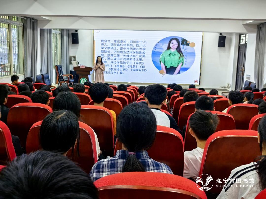 本次讲座由四川省作协会员、四川大学文学硕士、四川职业学院副教授、遂宁本土诗人夏金兰主讲,夏教授从诗歌的释义、诗歌的意向与意境的营造、灵感的捕捉、格律的掌握、情感的真挚表达、修改与雕琢等多方面与同学们进行交流,一起探秘诗歌的密码,解锁诗意时光,鼓励同学们多阅读、勤写作,在诗歌的世界里创作出属于自己的佳作,传承和弘扬中华的优秀文化,为大美遂宁创作出更多动人心弦的精美诗歌。(来源:遂宁市图书馆)