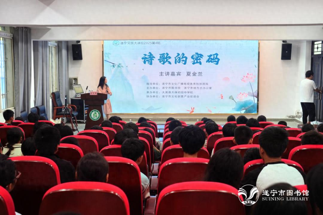 在文学阅读和初高中语文学习中,诗歌是一块璀璨的瑰宝,可不少同学在面对诗歌时,总有一种雾里看花的感觉,难以理解诗歌的内涵。为了让乡村中学的同学们更快更精准的找到诗歌的密码,更好触摸诗人的内心世界,提升对于诗歌的阅读理解能力和写作能力,用更美的诗词来表达对家乡的热爱,表现遂宁美,助力乡村文化振兴,5月27日,遂宁文旅大讲坛2025第四期走进大英县天保初级中学,以《诗歌的密码》为题,与师生们共同开启探秘诗歌的慢时光。