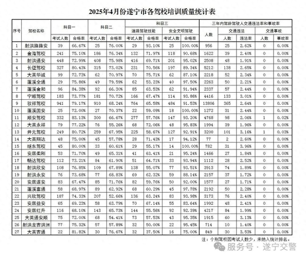 为切实加强道路交通安全源头管理,强化机动车驾驶人培训和考试质量监督,帮助广大群众全面了解全市各驾校培训质量情况,根据《机动车驾驶证申领和使用规定》相关要求,遂宁市公安局交警支队对2025年4月份全市各驾校驾驶学员考试合格率、三年内驾龄驾驶人的交通违法率和交通事故率予以公示。(来源:遂宁交警)
