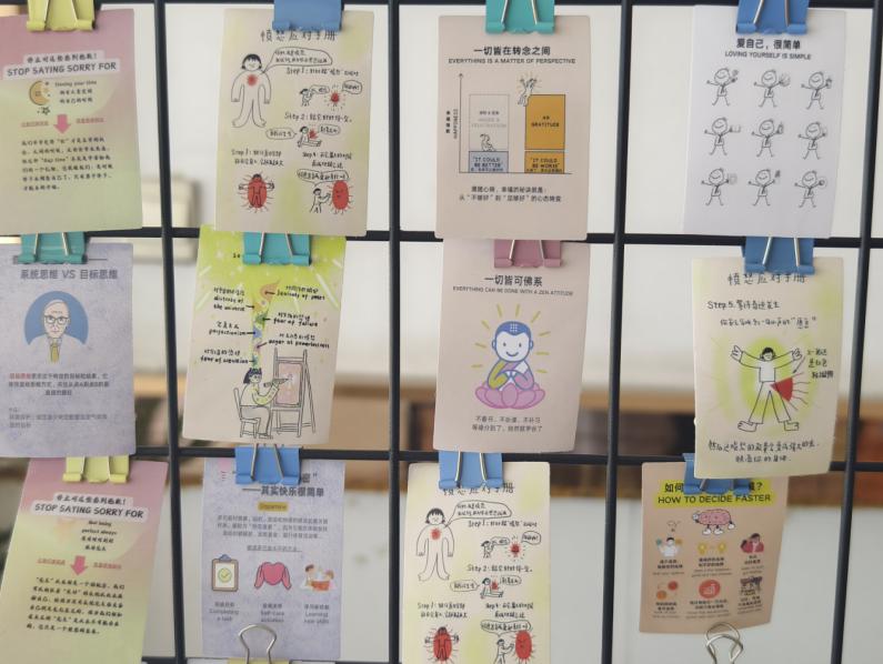 在教学楼走廊设置主题展板,张贴100条“爱自己”行动指南,内容有“一件让我感到快乐的小事”、“一个照顾自己身体/心情的方法”、“一句想对自己说的鼓励的话”等具体、微小的“爱自己”行动。