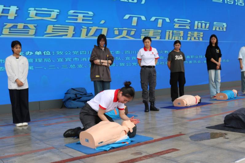 活动现场还设置了“安全知识嘉年华”体验区。成为了叙州区柳嘉职业技术学校同学们探索应急技能的“欢乐课堂”。宜宾市消防救援支队展示了先进的消防装备,并组织师生参与了灭火器使用实操演练;宜宾市红十字会专业讲师现场教授心肺复苏和创伤救护技能,师生们踊跃参与,通过实践进一步巩固了所学知识。