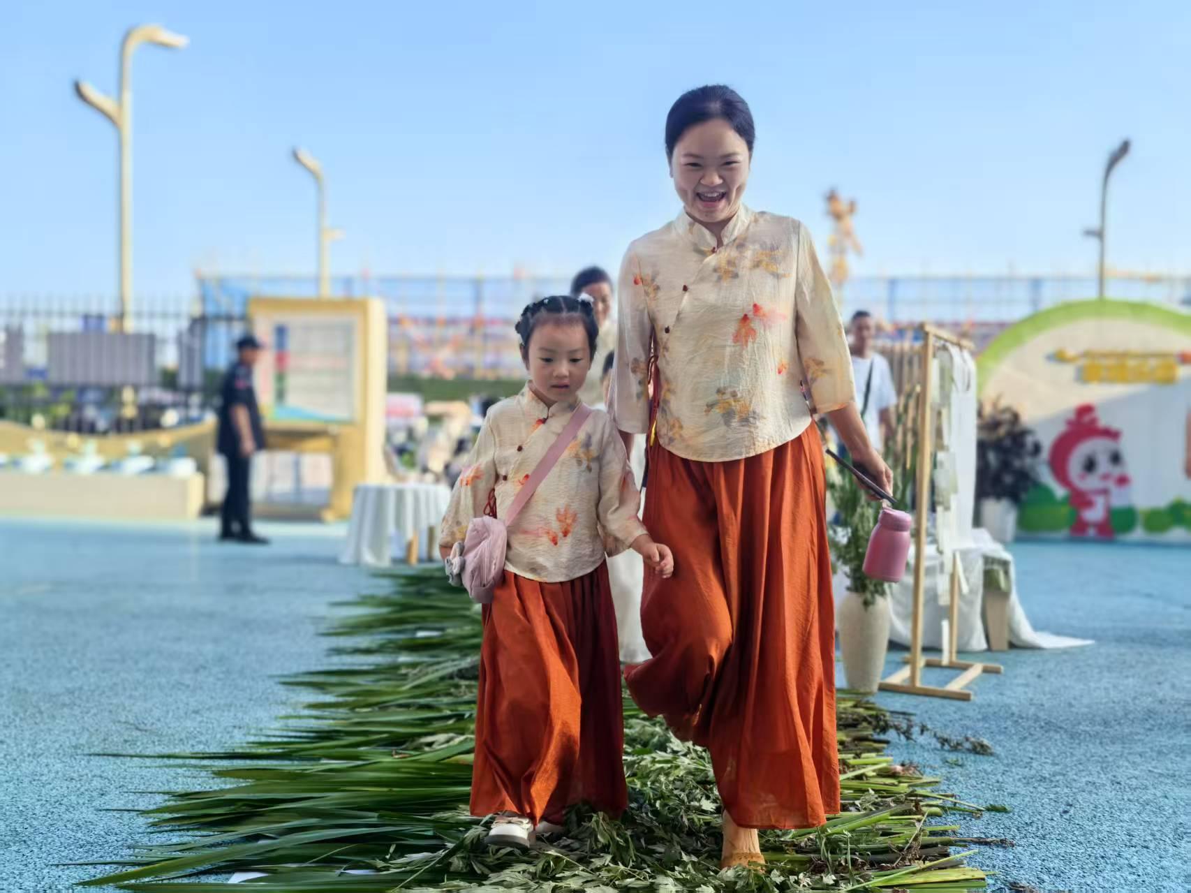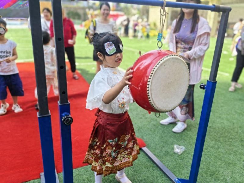 接着,幼儿带来活力开场舞——快乐体操,灵动身姿与灿烂笑容尽显童真朝气,现场气氛热烈。随后,游园活动正式开启。现场设传统游戏区和非遗手工区,让幼儿与家长沉浸式体验,感受传统文化的魅力。在非遗手工区,孩子们在教师指导下,和家长一起编织五彩手链、制作漆扇、香囊,体验传统技艺精妙;传统游戏区,投壶、蹴鞠、射五毒等经典游戏吸引亲子携手挑战,传承古老竞技精神;此外,“汉服T台秀”环节,幼儿自信展示传统服饰,增强了对传统文化的认同感与自豪感。