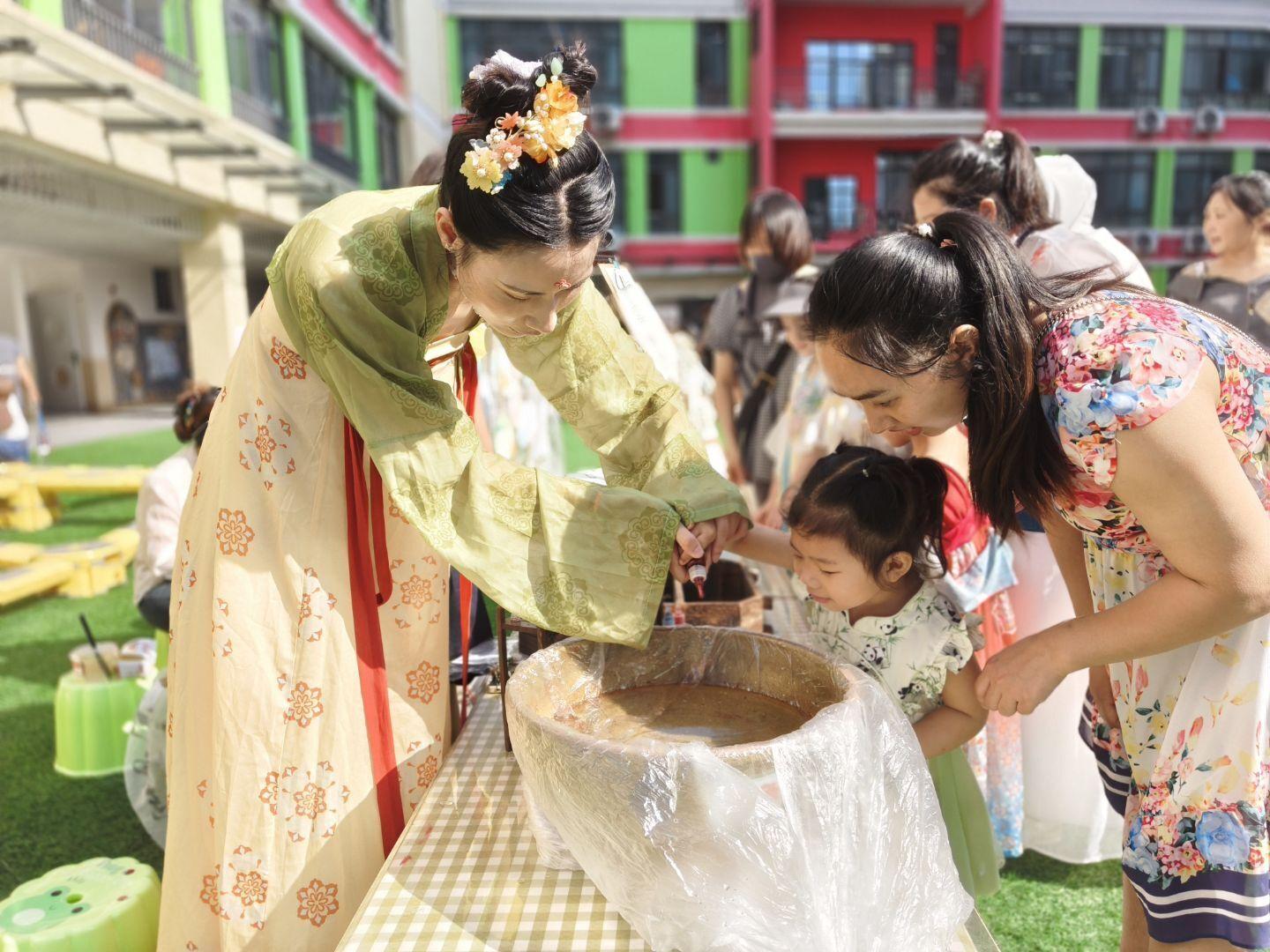 活动当日,幼儿与家长身着汉服有序入场,开启这场韵味十足的活动。活动伊始,举行庄严的升旗仪式,全体人员肃立行注目礼,五星红旗在激昂国歌声中冉冉升起。
