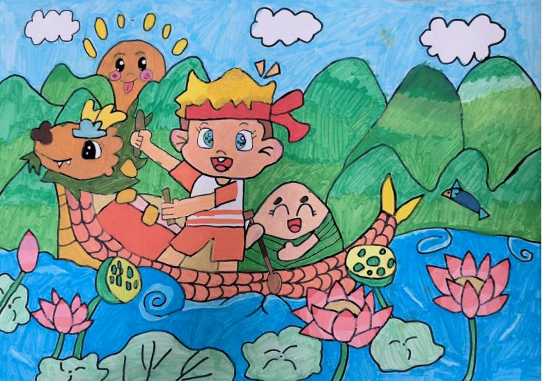 最后,同学们拿起画笔,画出了“我眼中的端午节”。有的画了龙舟竞赛的热闹场景,有的画了家人包粽子的温馨画面,还有的画了绿油油的艾草和香喷喷的粽子……”一幅幅充满童趣的作品,展现了孩子们对传统节日的理解和喜爱。