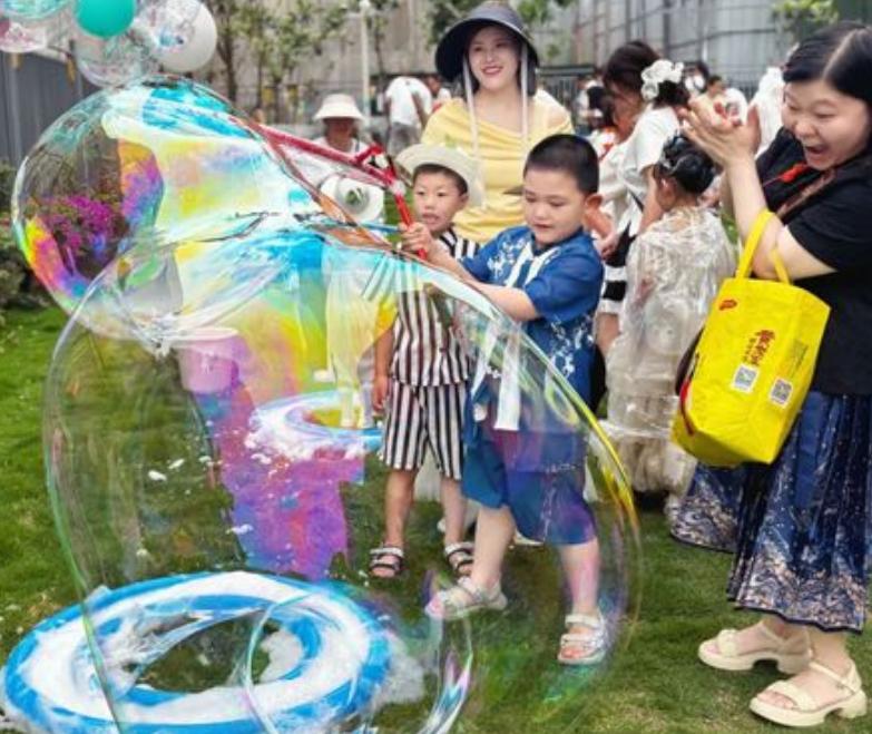 亲子们正沉浸在泡泡魔法中,大圈套出梦幻泡泡,彩虹泡泡似精灵般穿梭,三江新区沙坪幼儿园孩子们笑着追逐,爸爸妈妈也童心大发,一起编织这场泡泡梦幻之梦。