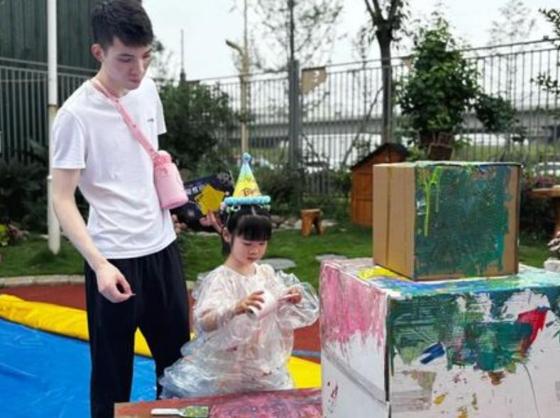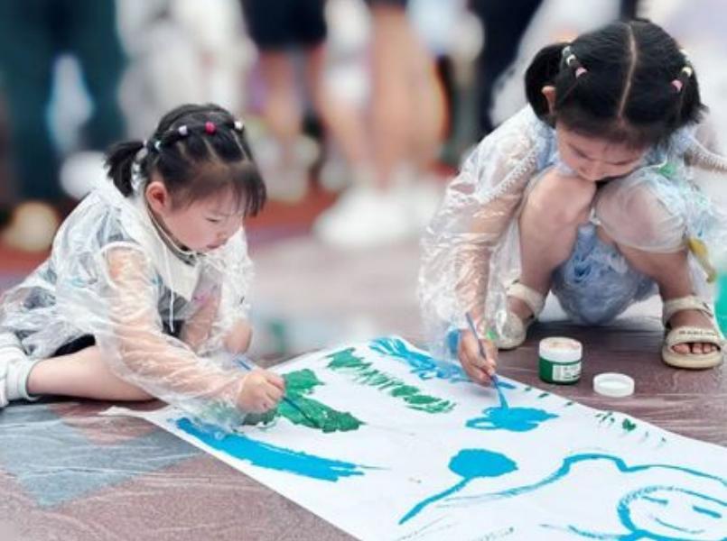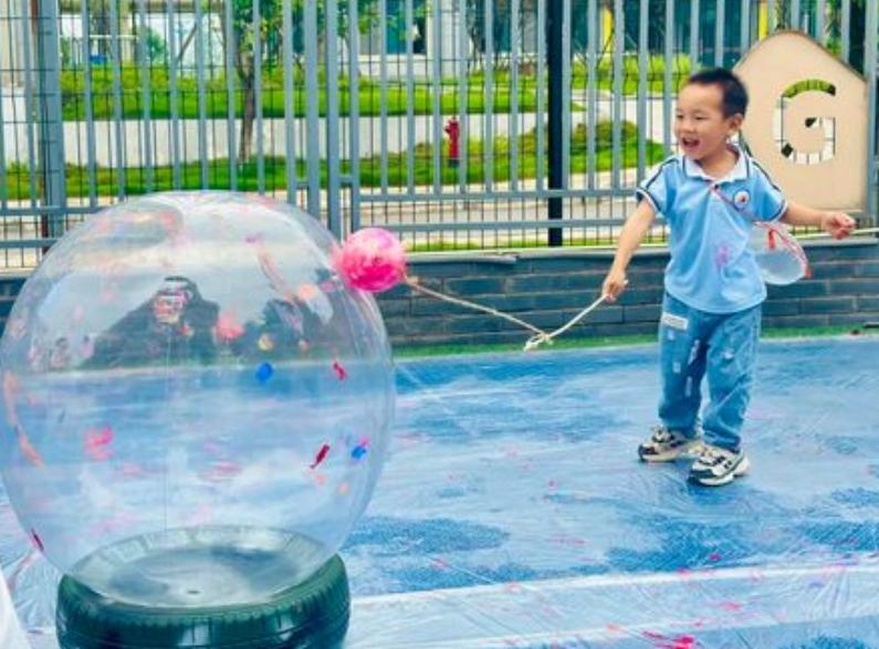 三江新区沙坪幼儿园孩子们拿起波波球、泡沫球,蘸上颜料,麻绳助力,尽情击打,在色彩与碰撞中,情绪悄然舒缓,留下温馨亲子回忆。