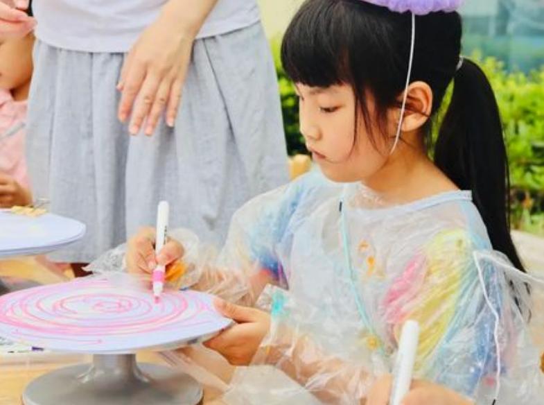 三江新区沙坪幼儿园小朋友们同家长拿起水彩笔,在转盘上边转边画,肆意挥洒童真,或甩动颜料,在吊架上创作流体画,感受色彩碰撞的奇妙。