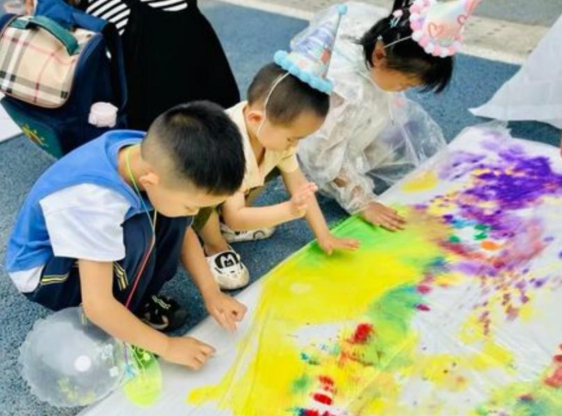 在颜料派对里撒欢,用小手拍打KT板、防尘膜,让色彩绽放出各种可爱形状,还能用脚丫踩出夏天的色彩,留下快乐足迹。