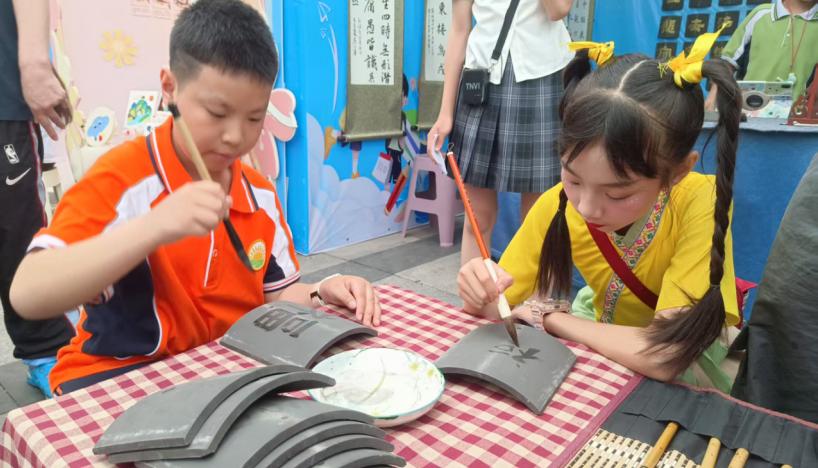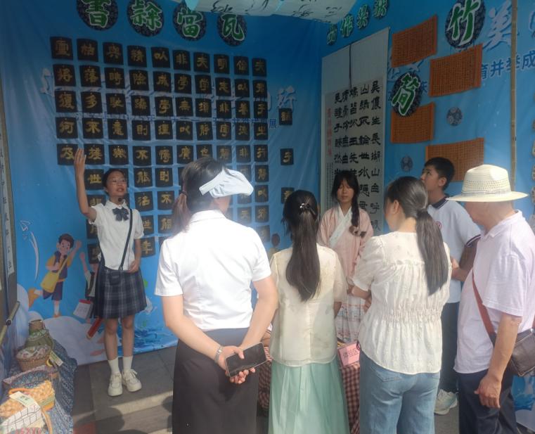 为了让观众更深入感受书法魅力,江安县淯江初级中学校特别设立了体验区。在这里,孩子们可以现场在瓦片上书写,感受书法与古老材质碰撞出的独特韵味。一旁的文创区的手工社团藤编作品同样吸睛,散发着独特的魅力。