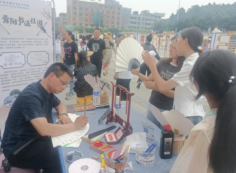 此外,江安县淯江初级中学校开展的文扇雅字活动为炎炎夏日增添了一抹文化清凉,该校书法老师马国春现场题字,笔走龙蛇间,一幅幅墨宝应运而生,引得观众驻足欣赏。