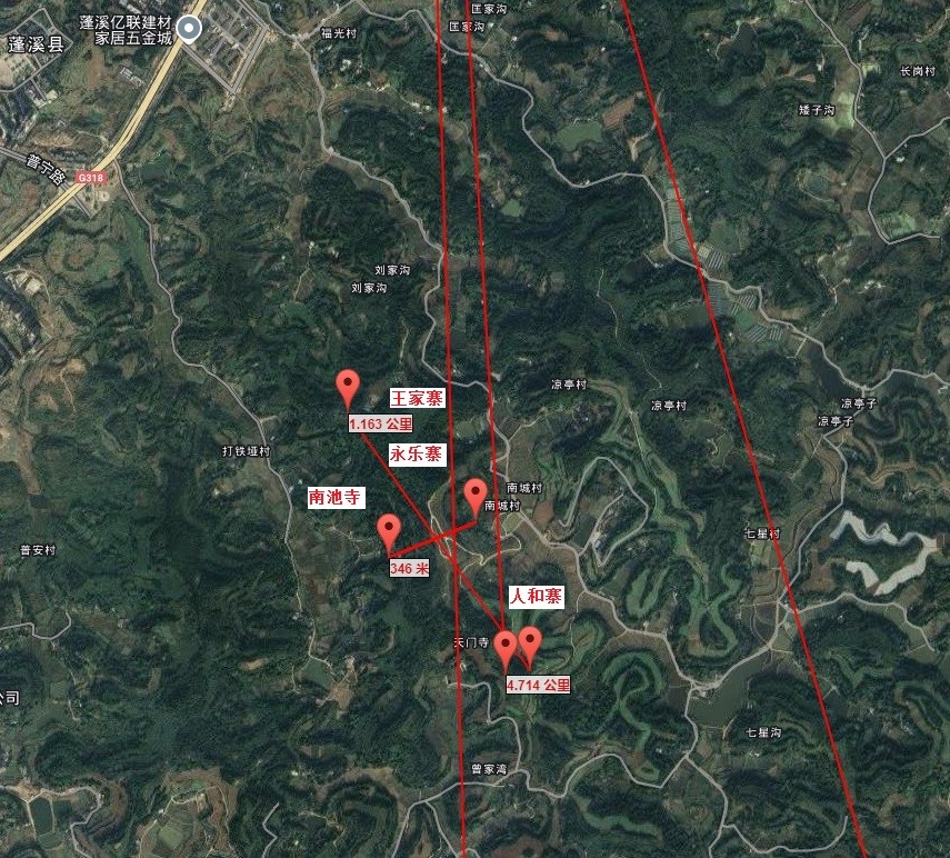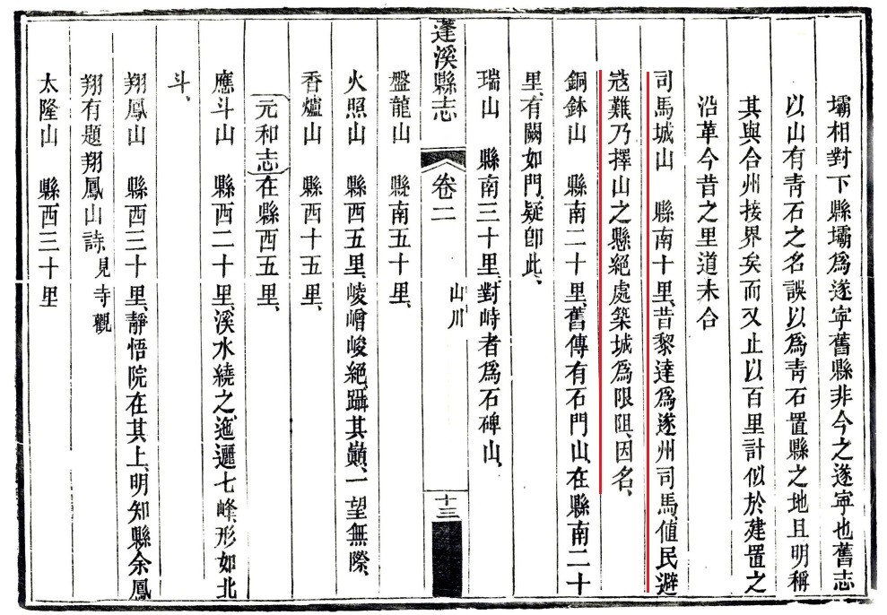 从上述史料所载“永乐寨”“司马城山”等地,均为“在县南十里”,而最早记载为南宋的《舆地纪胜》。彼时,蓬溪县治已在今赤城山麓,明代才迁到今天利商业街处。