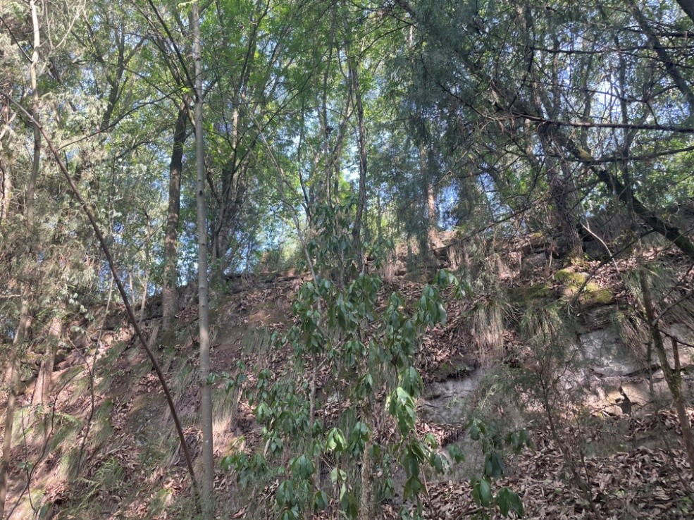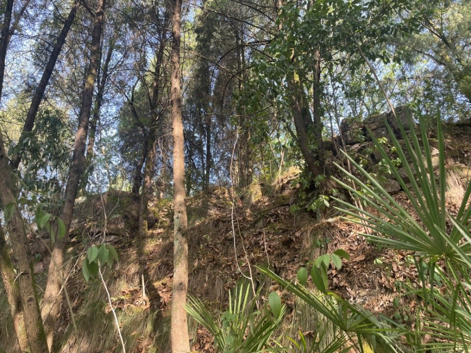 从王家寨出来,沿另一入山口蓬溪县照峰农业创新创业孵化园开车上山,约一公里,在被称为下寨的永乐寨寨坡下面停车。然后沿着一条垂高约20米、长500米左右的蜿蜒崎岖山路步行而上,来到一块林木葱郁的平整山顶,即为永乐古寨。