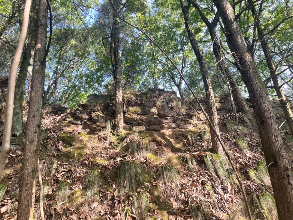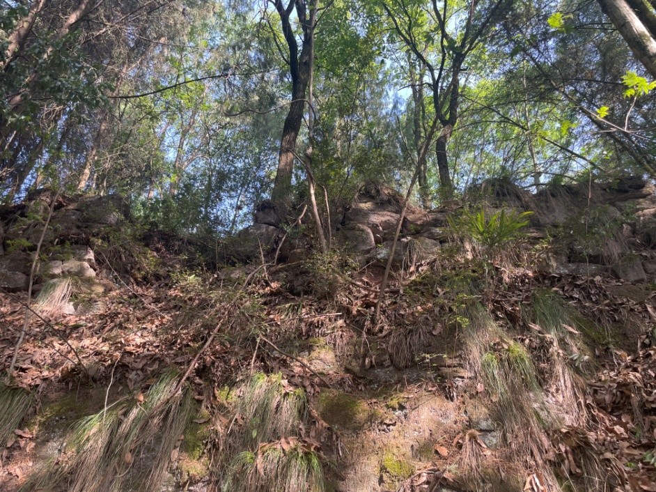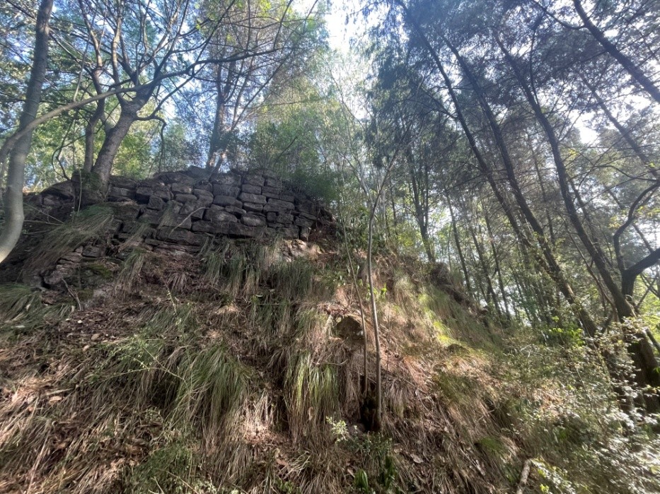 从第二层坡地向上望,可见寨顶多处石墙堡垒。