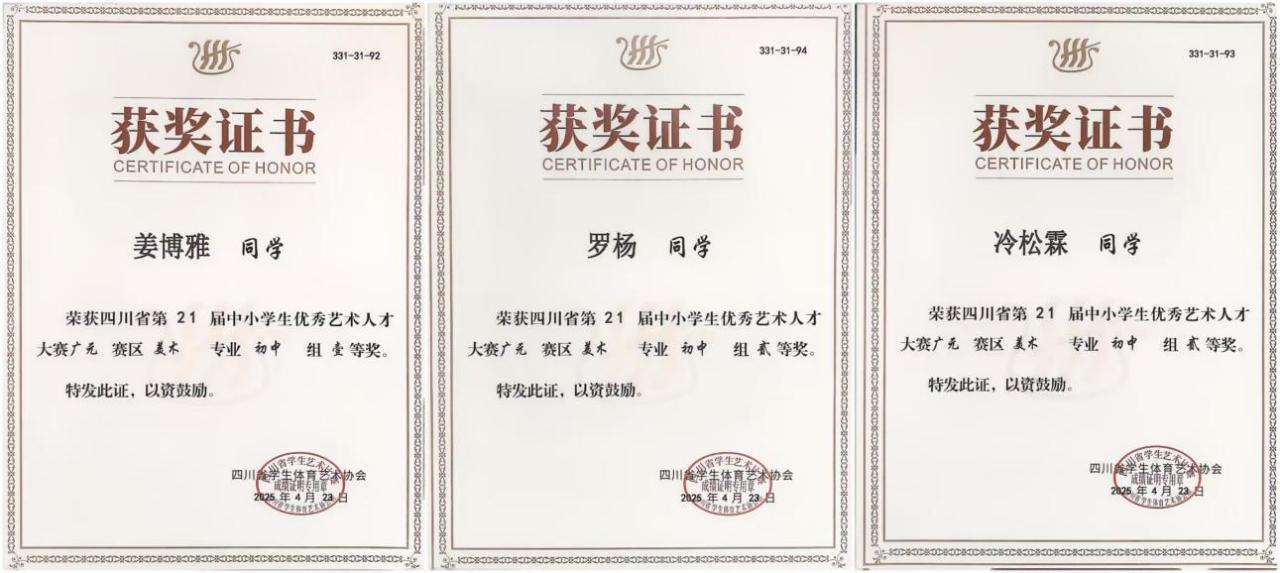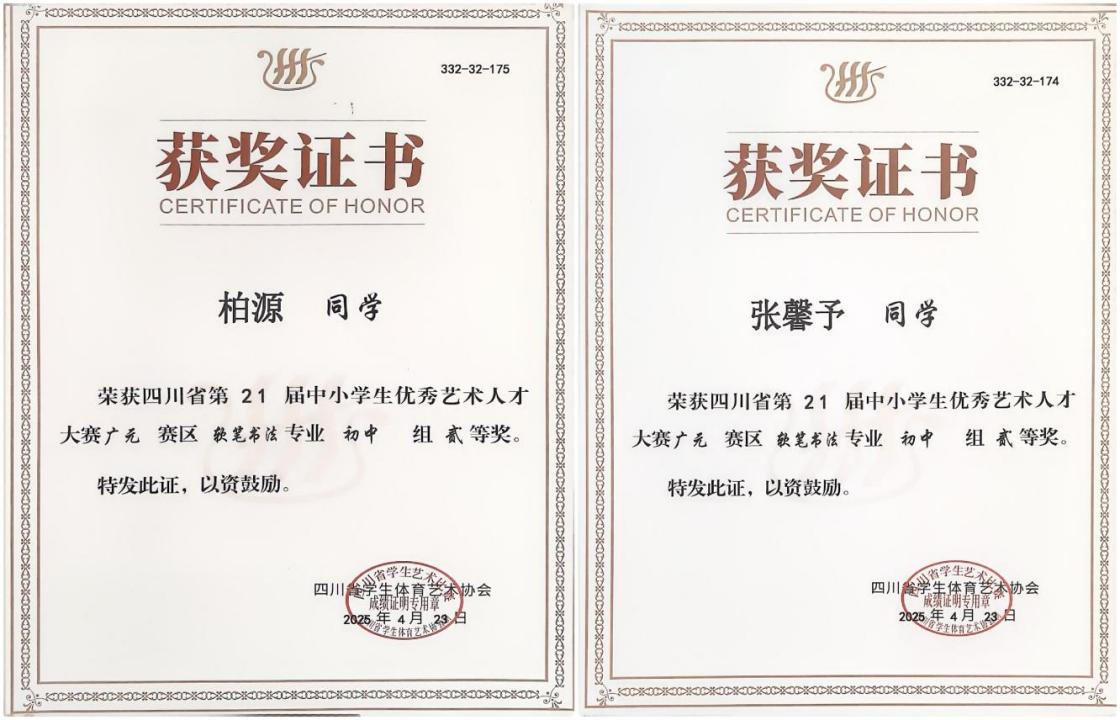 在深入学习贯彻党的二十大精神、全面落实“五育并举”育人方针的引领下,广元市正德中学于2025年四川省中小学生艺术人才大赛(广元赛区)中再传捷报!我校学子以卓越的艺术才华和昂扬的精神风貌斩获多项荣誉,充分彰显了“正德、正言、正行”的育人理念,为学校艺术教育成果再添璀璨篇章。