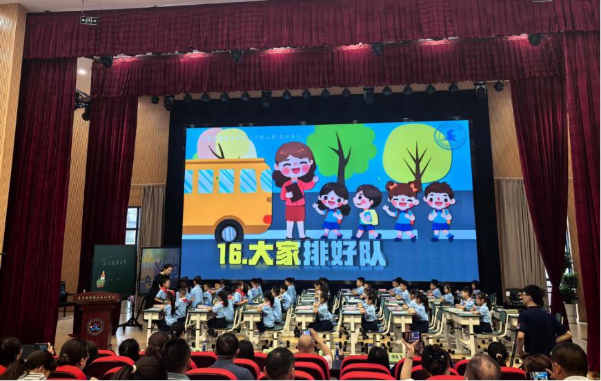 三江新区洗马池小学校胡悦老师执教一年级上册《大家排好队》,从一年级学生身心发展特点出发,通过生动有趣的视频和手指操游戏,引导学生在互动中养成遵守秩序的良好习惯。