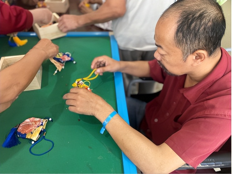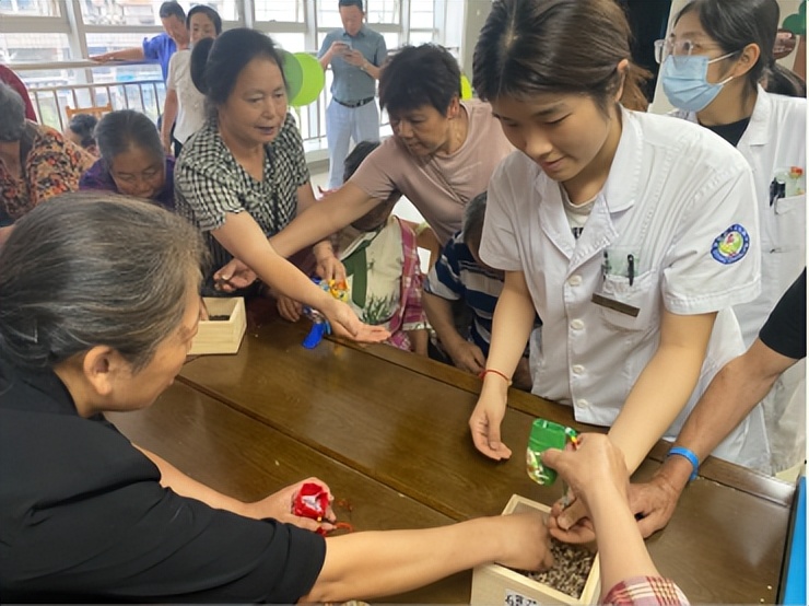 医务人员化身耐心的导师,细致地向患者们讲解制作步骤,并手把手进行指导。患者们专注地挑选着心仪的药材,小心翼翼地将它们填充进香囊袋,随后细致地缝合收口。在这个过程中,大家一边精心制作着香囊,一边热情地分享着关于端午的习俗与回忆。不一会儿,一个个饱含着端午祝福与安康寓意的香囊便在大家的手中诞生。淡淡的药香弥漫在空气中,不仅有着驱蚊辟邪的实用功效,更承载着每个人对健康的美好祈愿,让这个环节充满了温馨与意义。