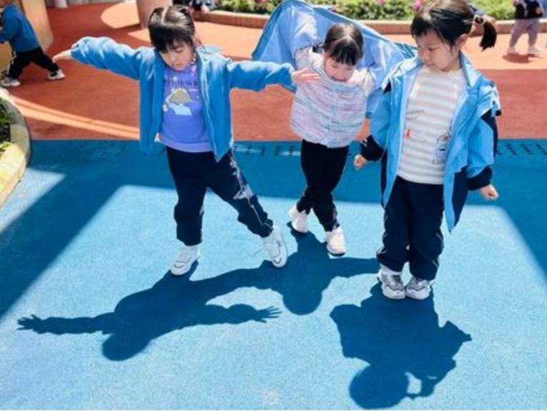在感受影子存在的过程中,发现影子会随着自己做出的动作发生相应的变化,这下可把她们乐坏啦,这儿摆个超人起飞的动作,那儿做个蝴蝶展翅的造型,眼睛紧紧盯着地上影子的变化,咯咯咯的笑声都快把阳光给震碎啦!