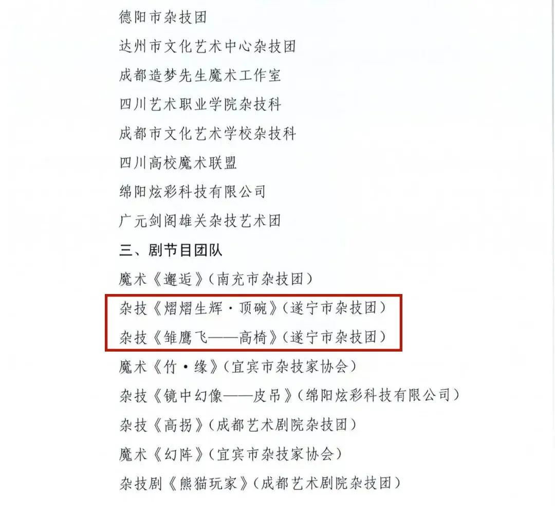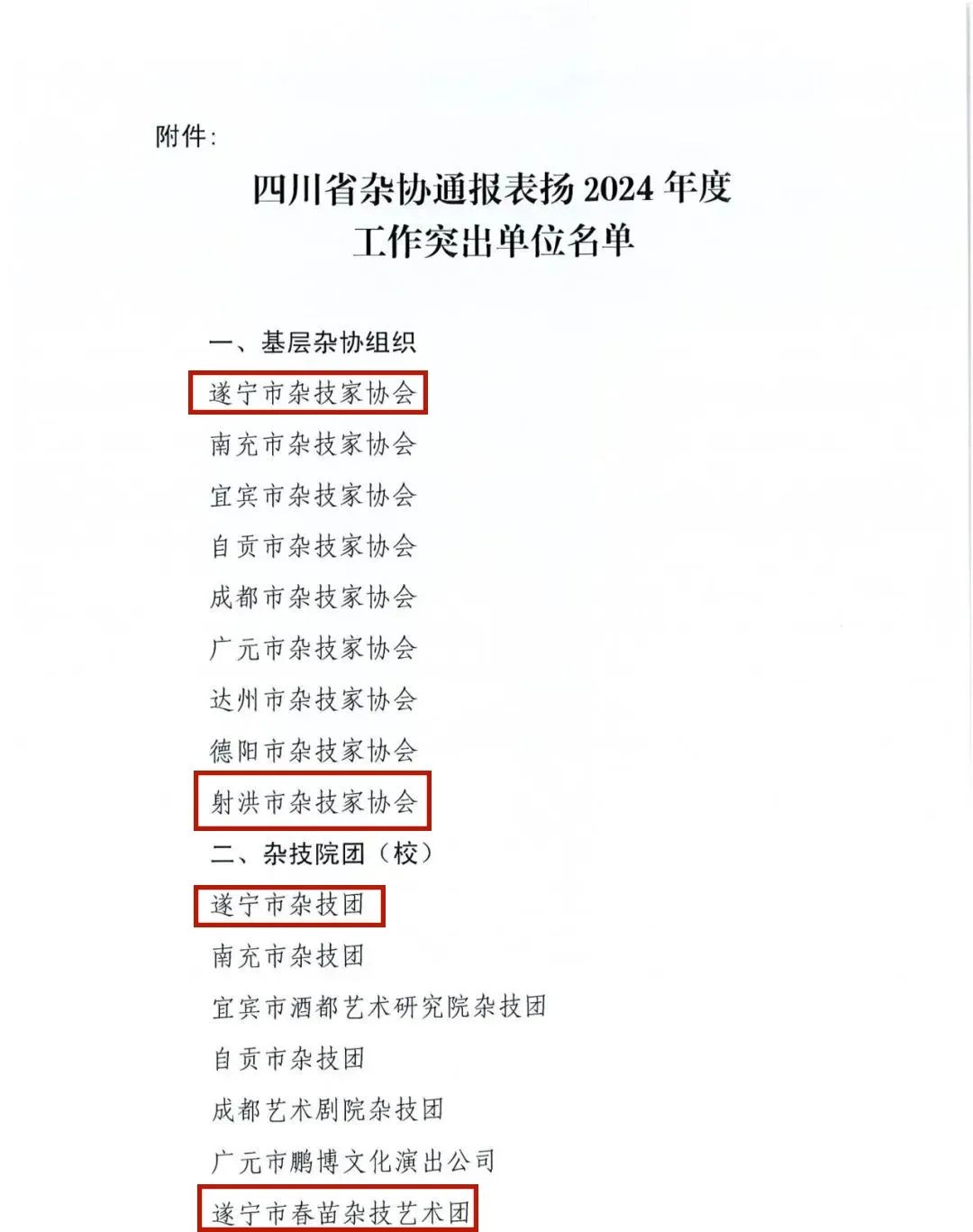 遂宁市杂技家协会、射洪市杂技家协会、遂宁市杂技团、遂宁市春苗杂技艺术团获表扬。