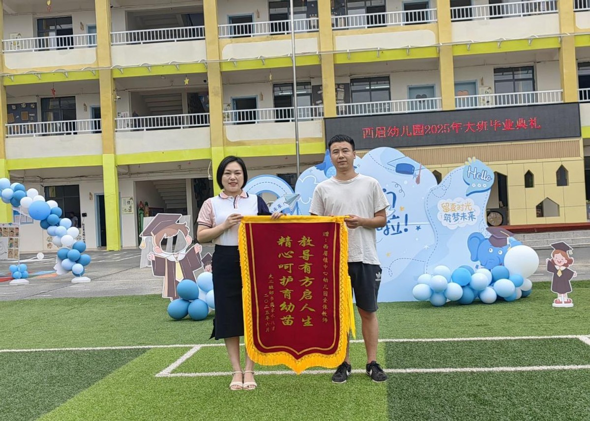 典礼在悠扬的《皇家萌卫交响》乐声中拉开帷幕。园长妈妈以《小小的梦想》为背景音乐发表致辞,寄语孩子们"带着幼儿园的勇气与爱,奔赴星辰大海"。教师代表郑玚老师含泪回忆四年点滴,一句"幼儿园永远是你们的家"让现场家长动容。大二班邹书奕家长代表全体家庭向幼儿园赠送锦旗,周园长接过锦旗时感慨:"这份信任是教育者最珍贵的礼物。"