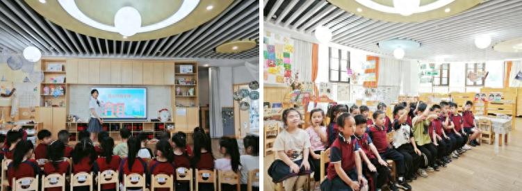在陈校长的引领下,孩子和家长们漫步校园主干道,聆听关于“知行楼”的讲解。脚下踩着世界地图,走廊上陈列着哥哥姐姐的手工、书法作品。孩子们踮脚细看,低声讨论:“这是哥哥姐姐做的吗?我们以后也能这样!通过实地观察、互动问答、亲身体验,孩子们直观感受小学环境与生活节奏。从自然探索到集体留影,每一步都在消解陌生感,为幼小衔接奠定情感与认知的基础。