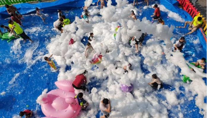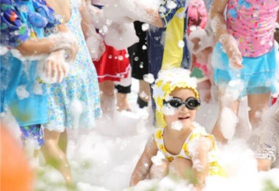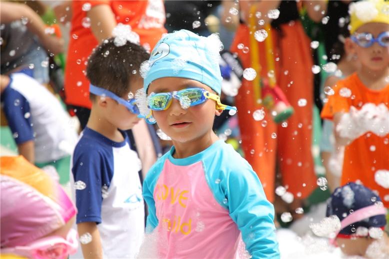活动中,幼儿园老师们精心设计的“传水挑战”“浮板比拼”“水上排球”等亲子游戏,让大家感受到无比的欢乐,特别是欢乐泡泡机让家长、小朋友和幼儿园老师们以“泡沫”为笔、“水花”为墨,在这个大型人造水上世界中勾勒出一座充满童趣的奇幻王国,让孩子们在亲子趣味游戏活动中感知温情、学会合作、释放天性。