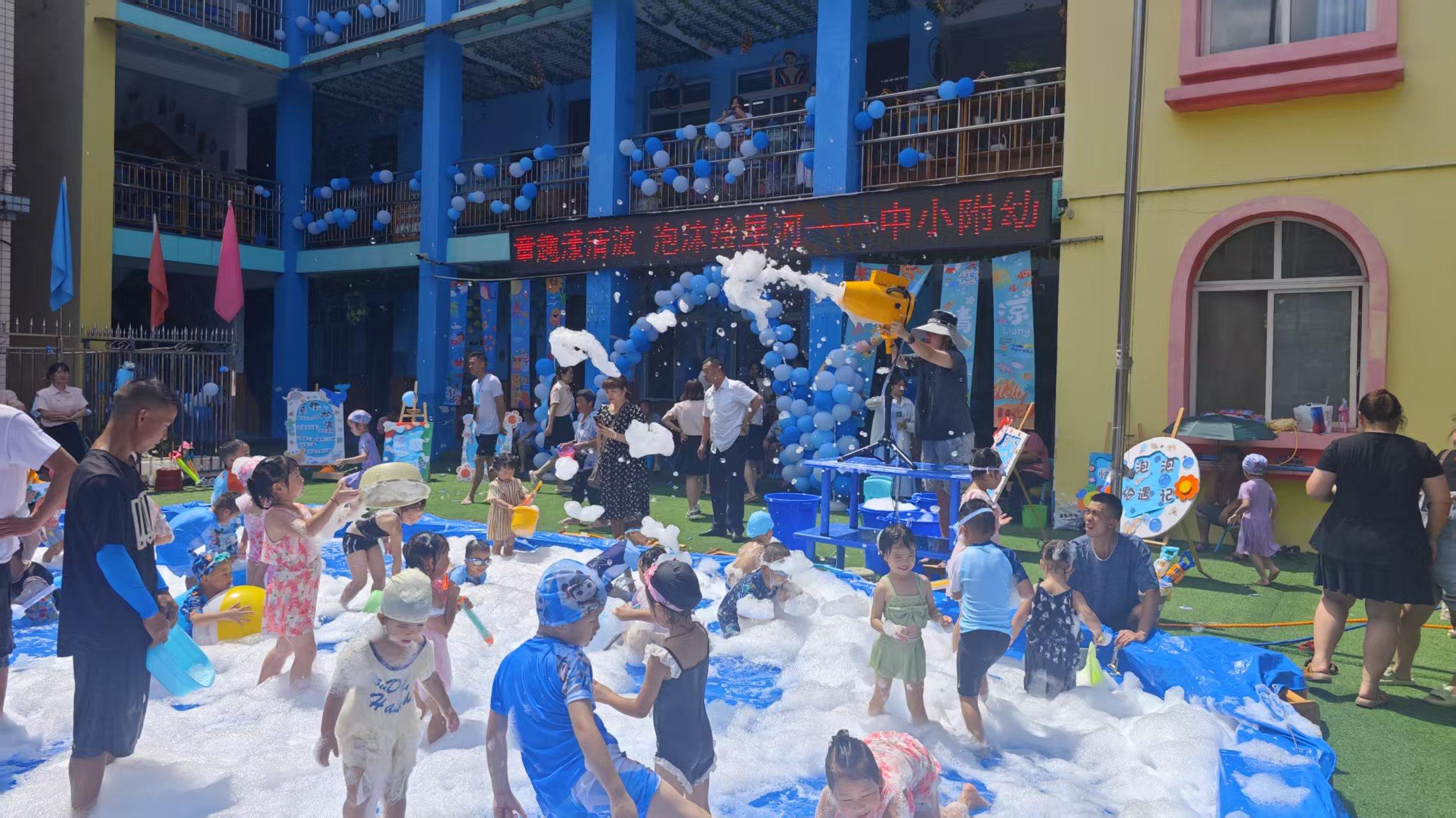 为让幼儿园小朋友感受到夏日阳光如金色的琴弦,激起孩子们对清凉的渴望,让小朋友体会到在泡沫与水花交织的世界中,童年犹如一张自由、幸福和欢乐的画布,6.26日,遂宁市安居区中兴小学附设幼儿园精心策划了“童趣漾清波,泡沫绘星河”大型亲子趣味活动。