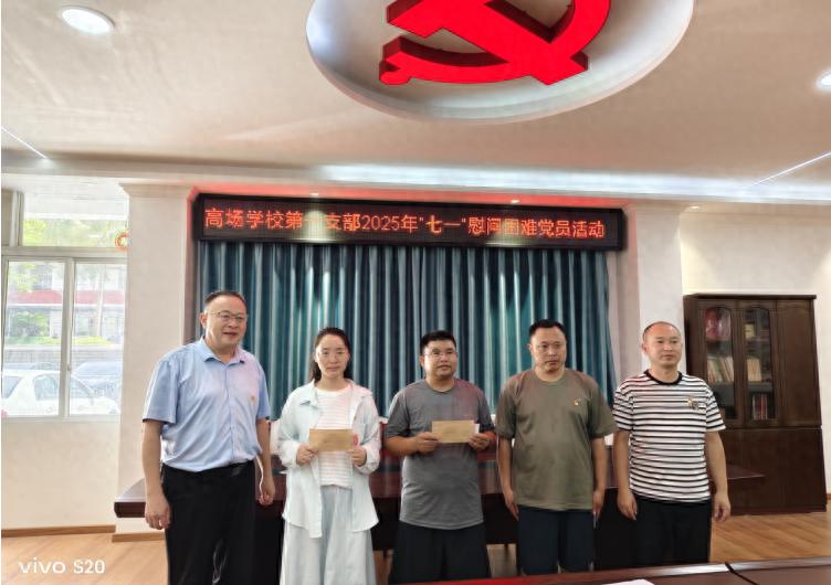 为迎接中国共产党104周年华诞,弘扬党的光荣传统和优良作风,2025年6月30日下午,宜宾市叙州区高场学校第一支部在学校党建活动室开展了“七一”慰问困难党员活动。学校党委书记唐义,副书记、校长伍宣云、副校长、第一支部书记王兵参加慰问活动,活动由伍宣云主持。