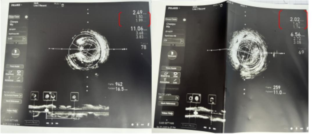 最终,在与家属沟通后,决定启用IVUS 技术。通过 IVUS 评估,医生精准锁定责任血管,在前降支植入支架,回旋支释放药物球囊,无需干预的右冠脉则采用强化药物治疗。