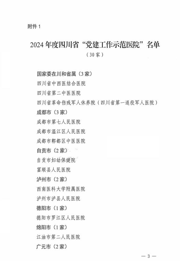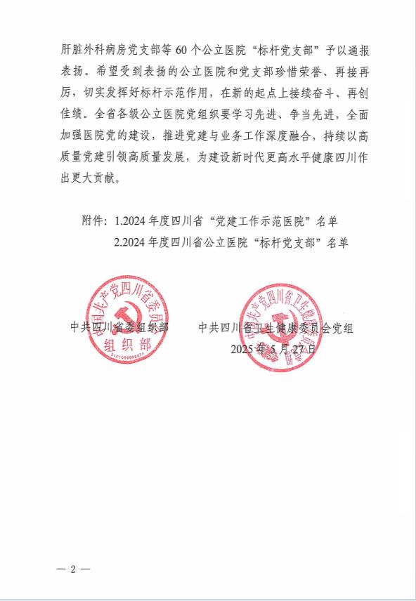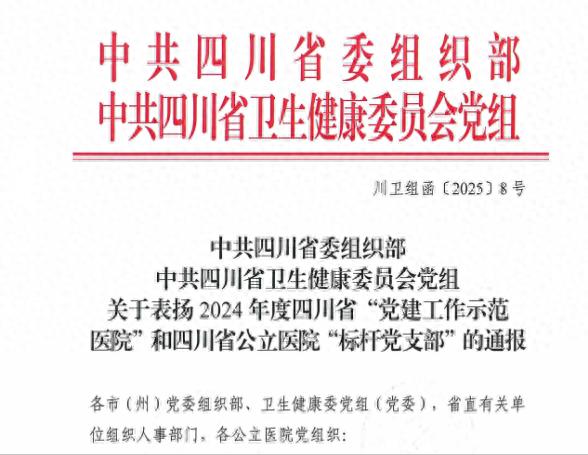 近日,中共四川省委组织部、中共四川省卫生健康委员会党组发布通报,表扬2024年度四川省“党建工作示范医院”和四川省公立医院“标杆党支部”。