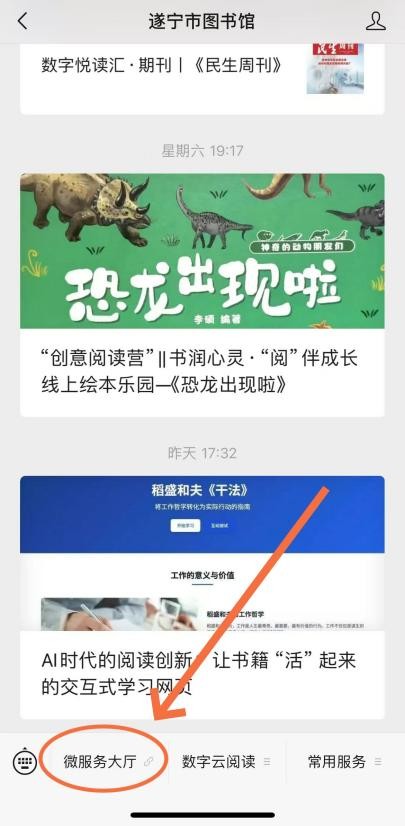 关注“遂宁市图书馆”公众号,点击底部菜单“微服务大厅”