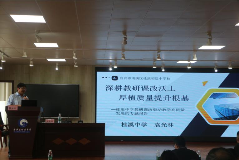 在研讨活动中,南溪区桂溪初级中学校党支部书记、校长袁光林代表学校进行了题为 《深耕教研课改,筑牢质量根基》的专题报告,系统介绍了桂溪中学教研课改探索实践。桂溪中学在“一体两翼三支撑”的体系下,以教学质量提升为核心,以教研改革和课堂变革为抓手,依托教师发展、多元评价、信息技术为支撑,通过完善制度、深耕教研、变革课堂等举措推进,取得教学高质量发展的显著成效,为区域同行提供了宝贵的参考。袁校长的专题报告得到与会专家的一致好评。