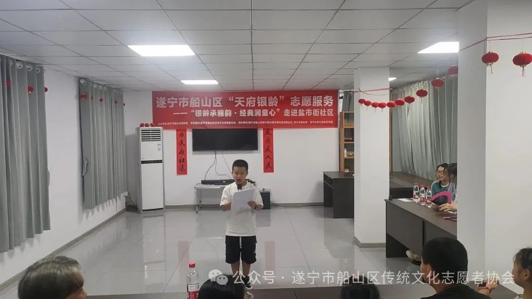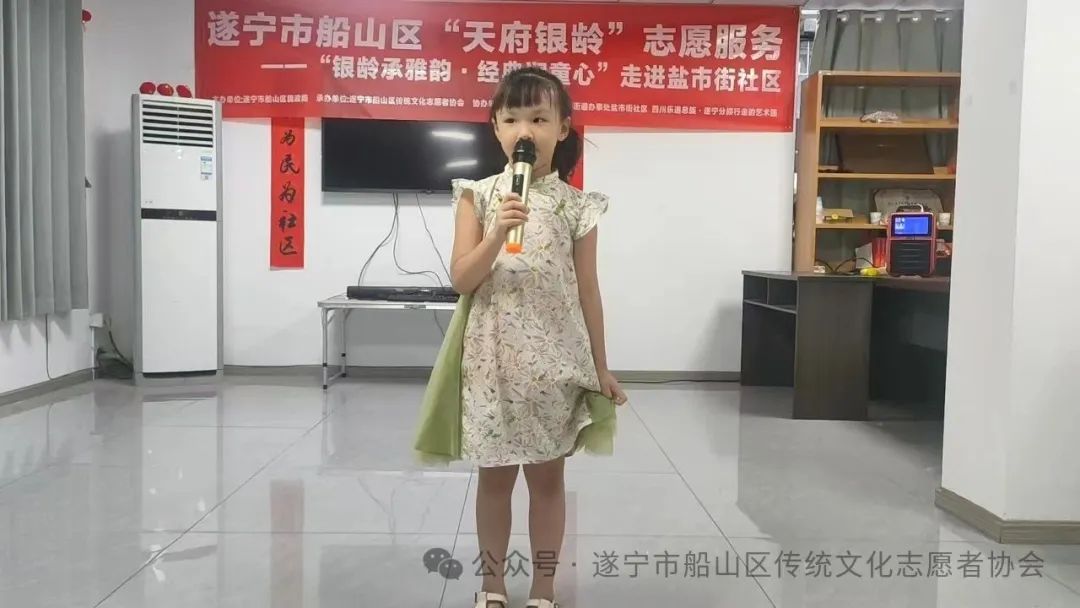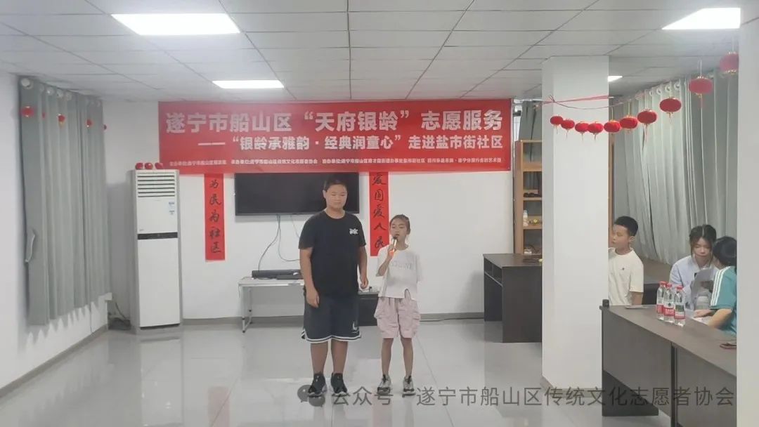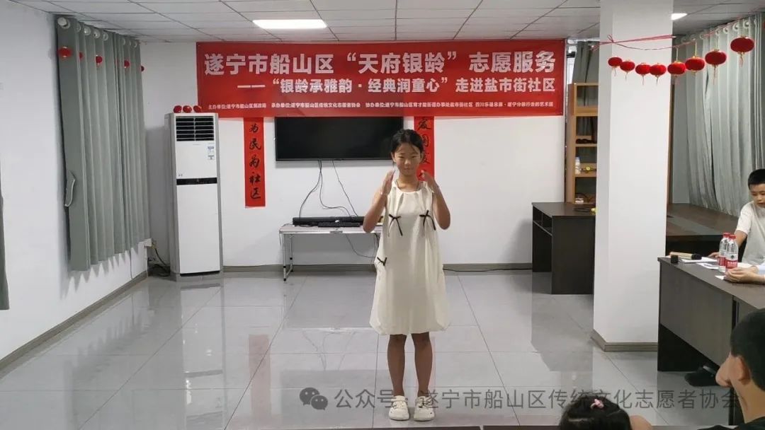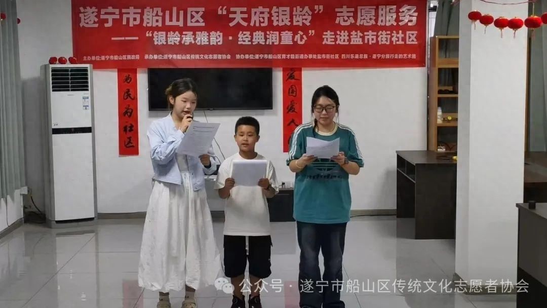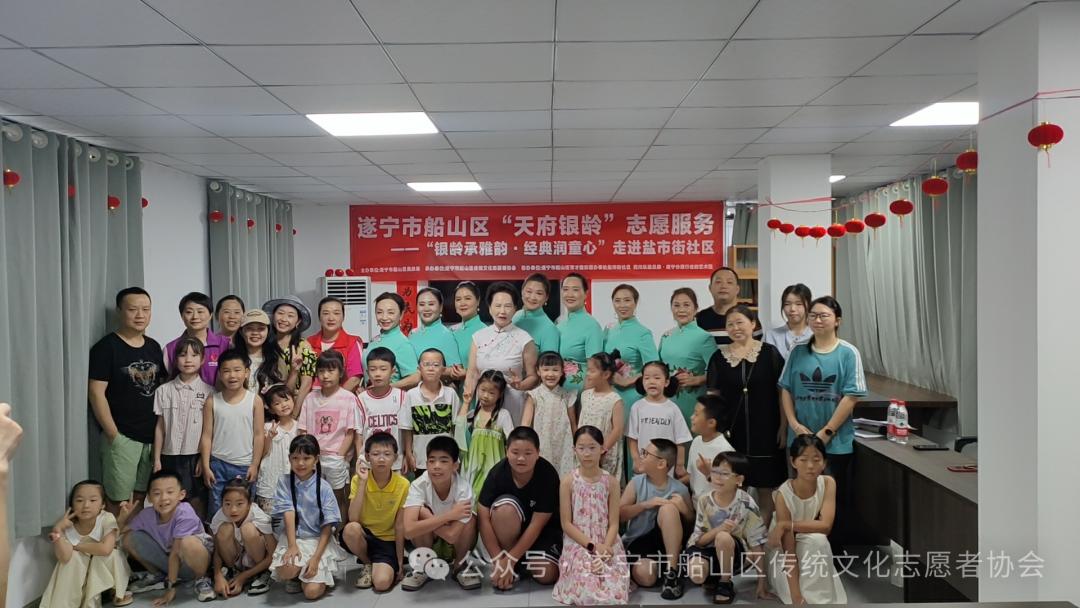 7月16日,遂宁市船山区“天府银龄”志愿服务活动“银龄承雅韵·经典润童心”走进盐市街社区,本次活动,由遂宁市船山区民政局主办,遂宁市船山区传统文化志愿者协会承办,遂宁市船山区育才路街道办事处盐市街社区,四川乐退总族.遂宁分族行走的艺术团协办,银龄志愿者、社区小朋友及家长们齐聚一堂,在古典雅韵与童真活力的交融中,共赴一场传统文化的盛宴。