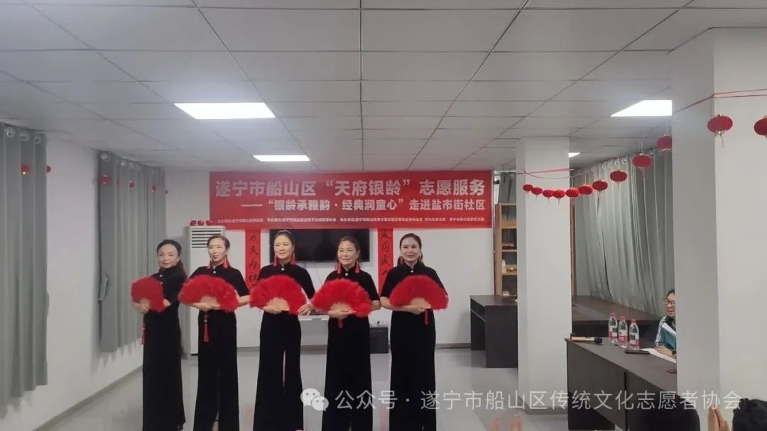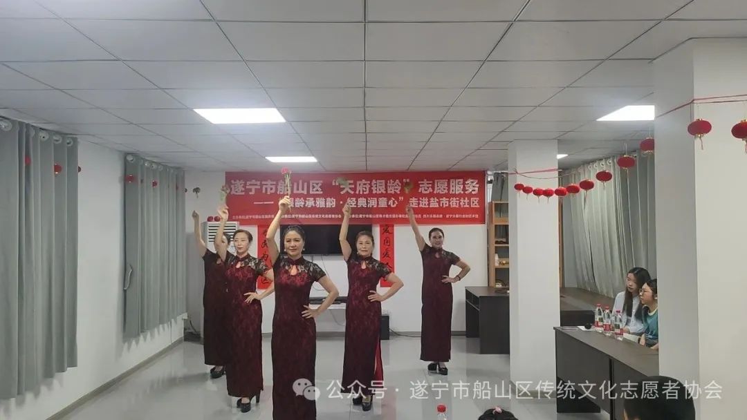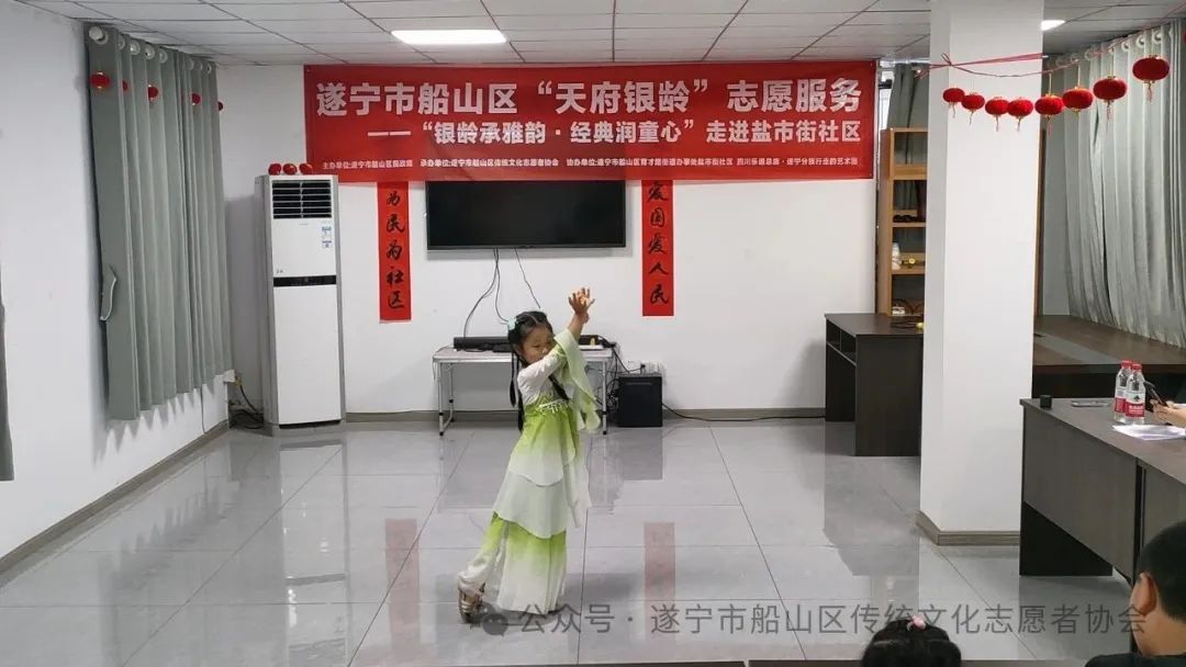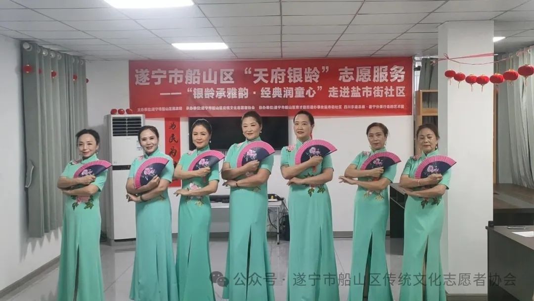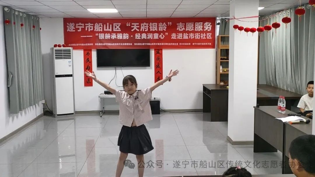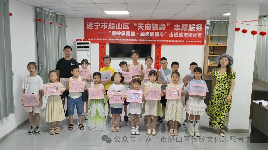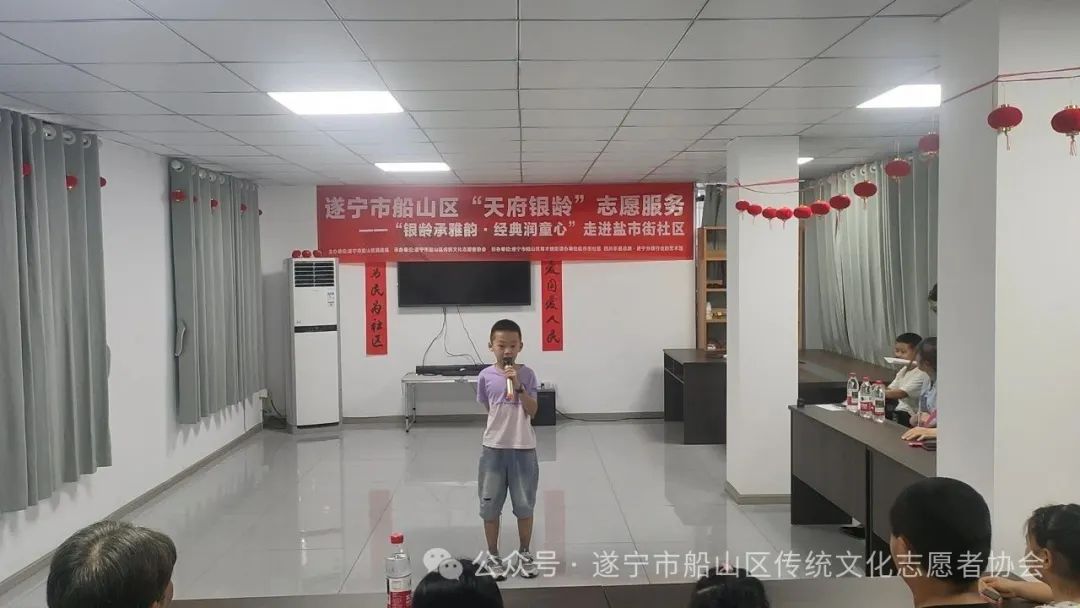 7月16日,遂宁市船山区“天府银龄”志愿服务活动“银龄承雅韵·经典润童心”走进盐市街社区,本次活动,由遂宁市船山区民政局主办,遂宁市船山区传统文化志愿者协会承办,遂宁市船山区育才路街道办事处盐市街社区,四川乐退总族.遂宁分族行走的艺术团协办,银龄志愿者、社区小朋友及家长们齐聚一堂,在古典雅韵与童真活力的交融中,共赴一场传统文化的盛宴。