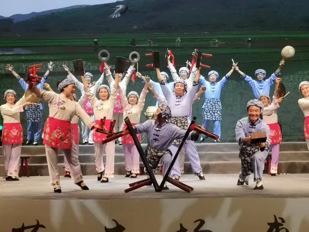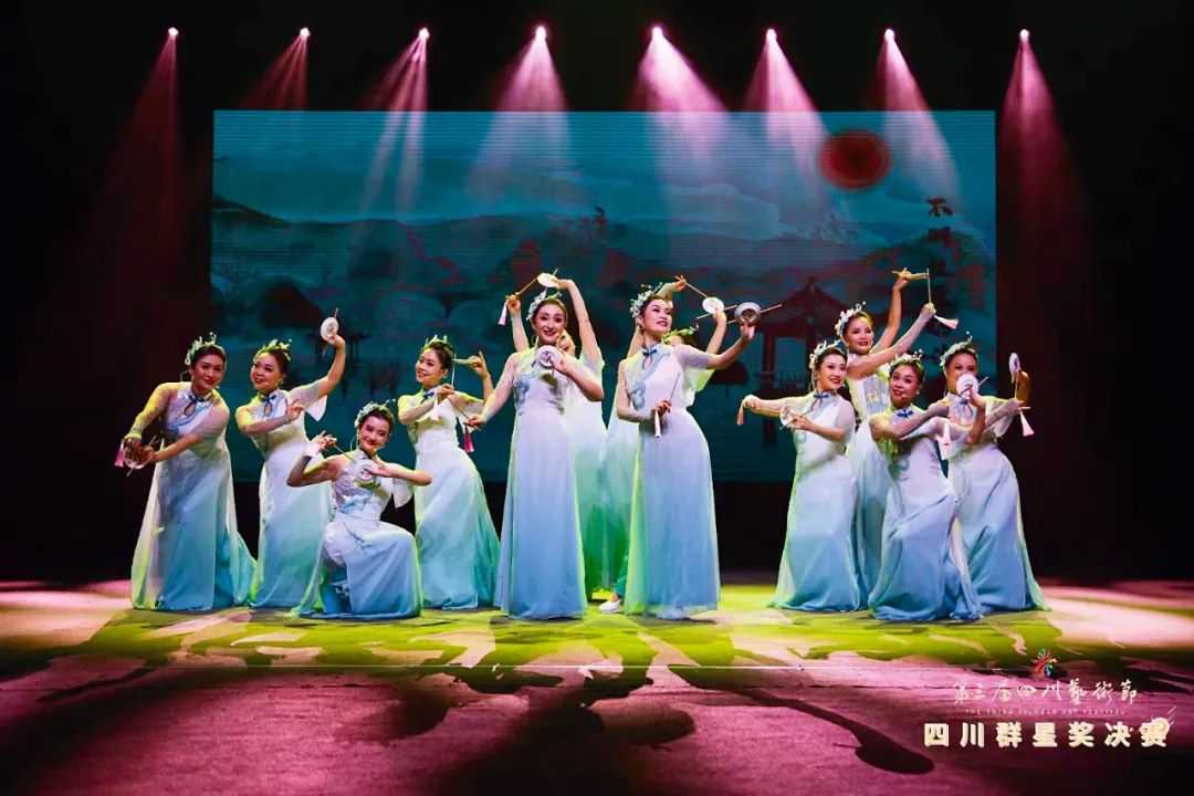 四川盘子《遂州小吃》围绕遂宁市特色名小吃创作,以非物质文化遗产“四川盘子”表现形式为主,由12名伴唱演员手持盘子,用现代的音乐、着民间传统服饰,通过“扣”“颤”“敲”等演奏技巧进行群唱群舞表演。