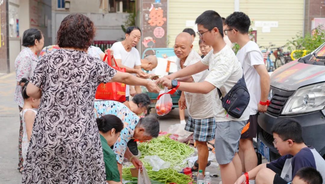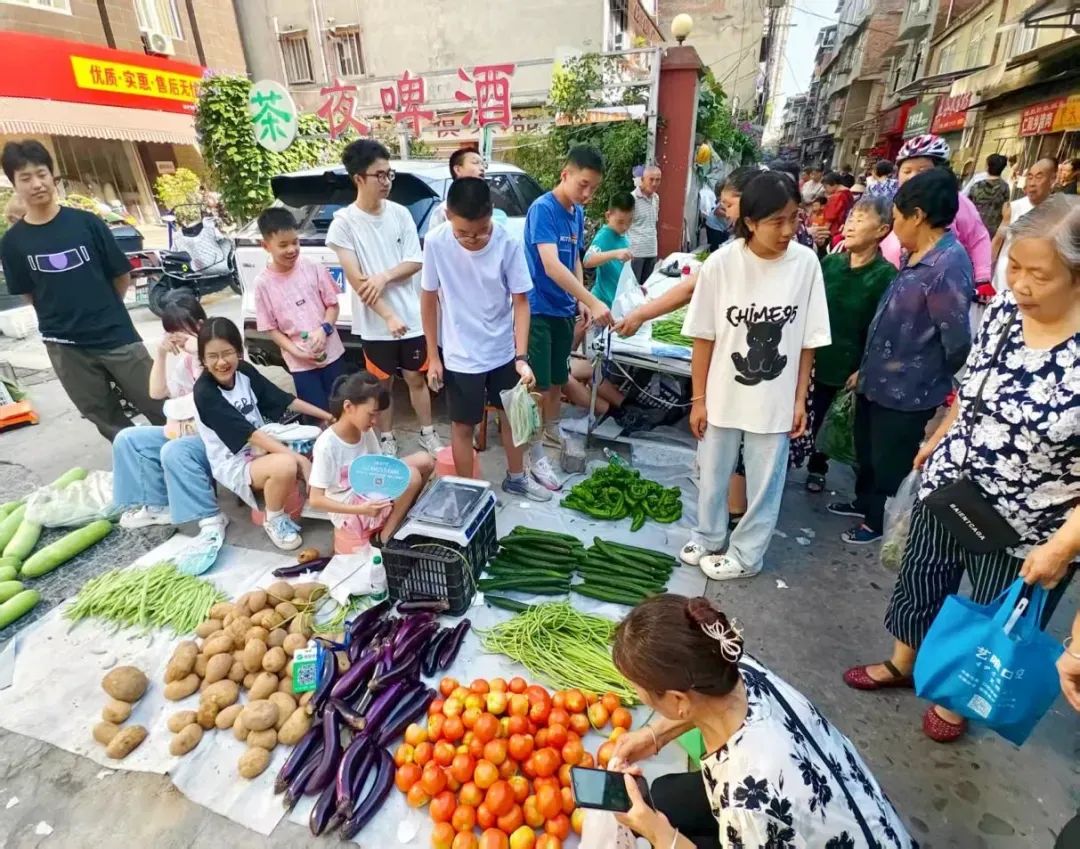 三伏天的阳光炙烤着大地,市场里熙熙攘攘。孩子们的脸颊晒得通红,汗水浸透了衣衫。有的孩子踮起脚尖帮顾客装袋;有的孩子从最初的腼腆退缩到鼓起勇气主动迎向顾客;还有的为准确算账急得满头大汗。搬菜筐、整理摊位这些体力活对他们而言并不轻松,但无人退缩。从第一期(7月26日-8月2日)到第二期(8月8日-13日),21名小志愿者接力参与。他们不仅在自己的摊位上努力,还主动帮助邻近摊位的老人售卖,将互助精神融入实践。