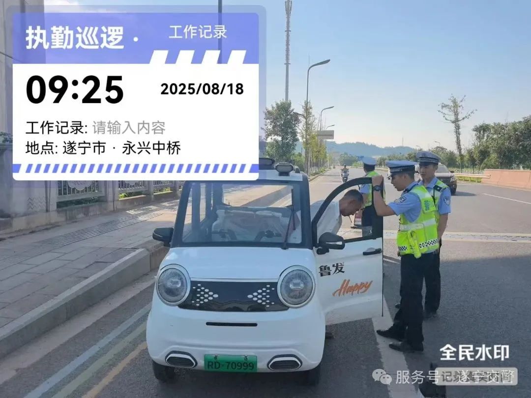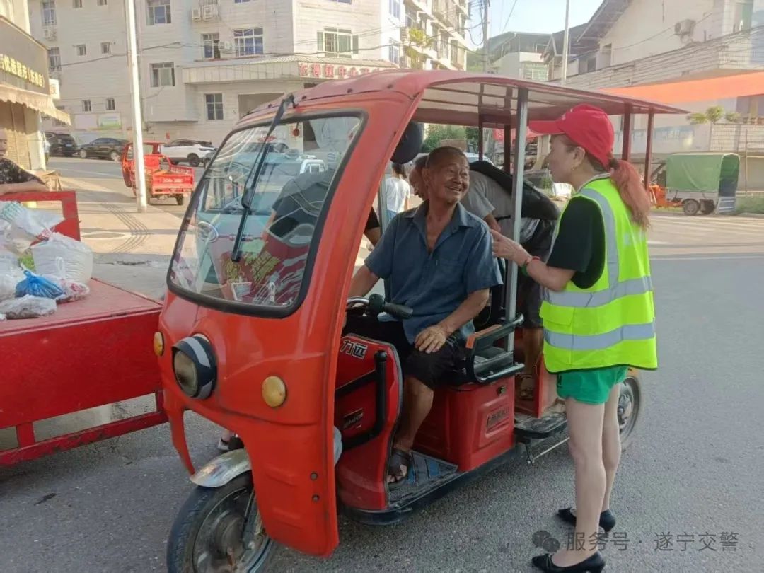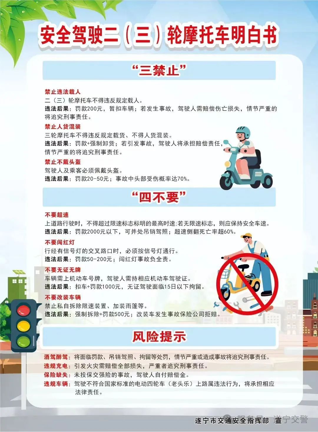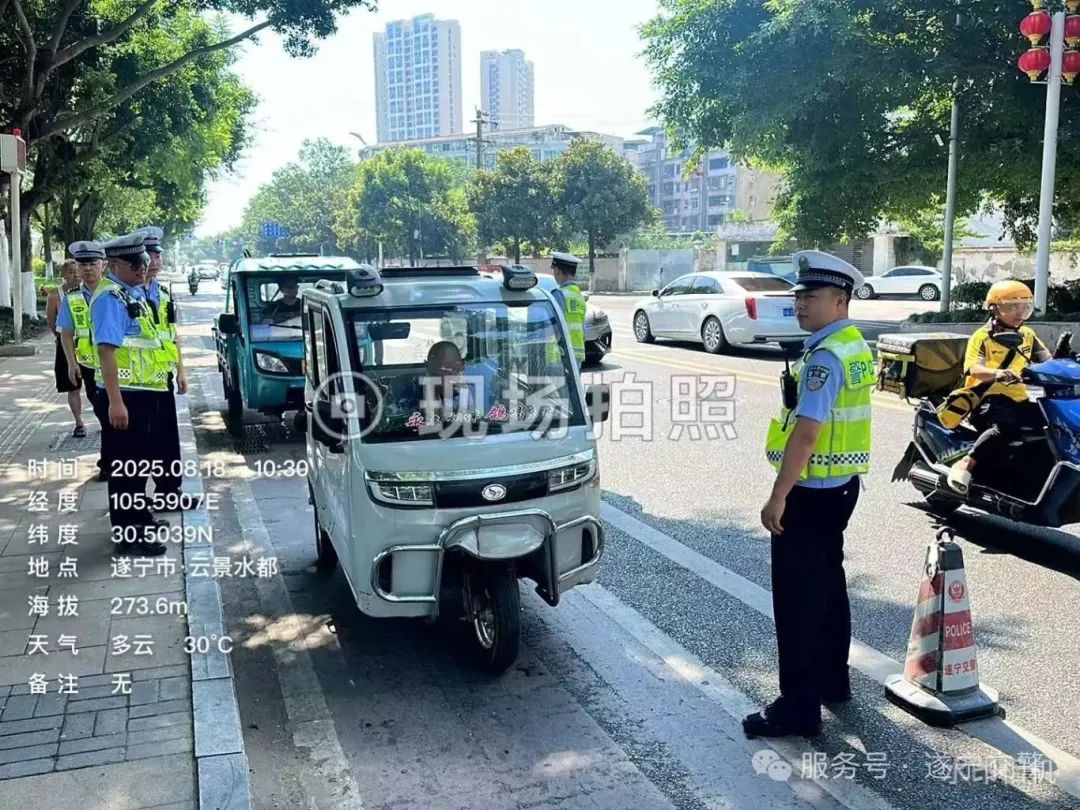 为持续深化道路交通安全综合治理工作格局,全力防范交通安全风险,坚决遏制较大事故发生,遂宁市全市公安交警重点围绕酒后驾驶、闯红灯、逆行、超员、无牌无证、非法安装雨篷、未按规定佩戴安全头盔等交通违法行为,在全市范围内持续开展低速电动二(三、四)轮车专项整治行动,全力营造安全、畅通、有序的道路交通环境。