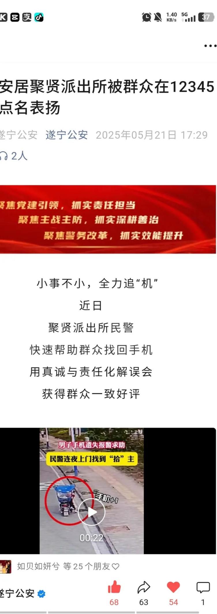 一面面红底金字的锦旗,记录着警民之间的暖心故事;12345热线里的声声感谢,传递着辖区群众的真诚认可……锦旗无声诉真情,口碑相传暖民心。今年以来,遂宁市安居区公安分局聚贤派出所紧扣“五合六防”要求,因地制宜、综合施策,以矛盾化解赢民意,以高效服务惠民生,以打防并举安民心,在辖区群众的口碑中书写平安答卷。