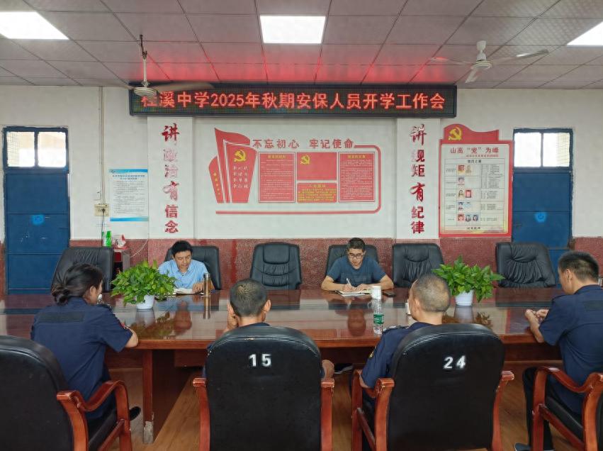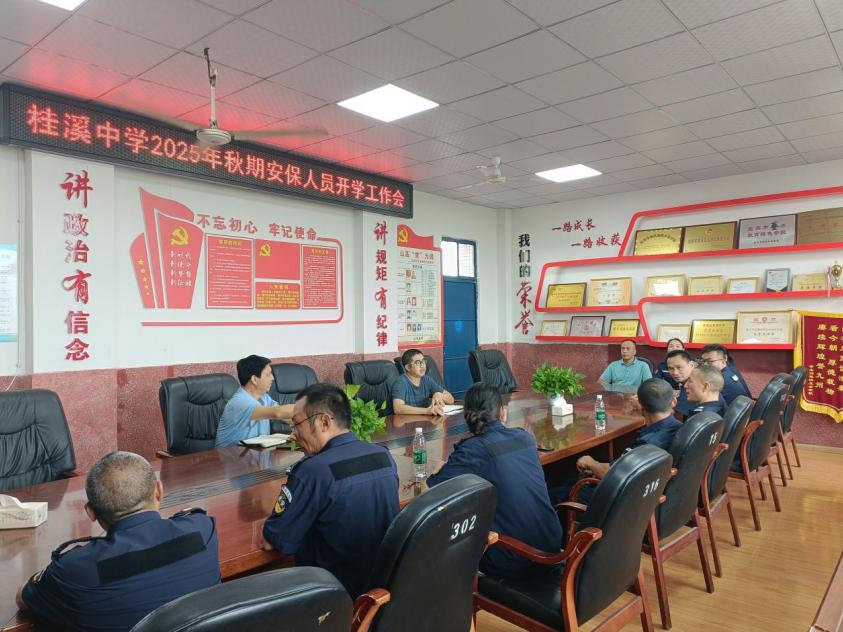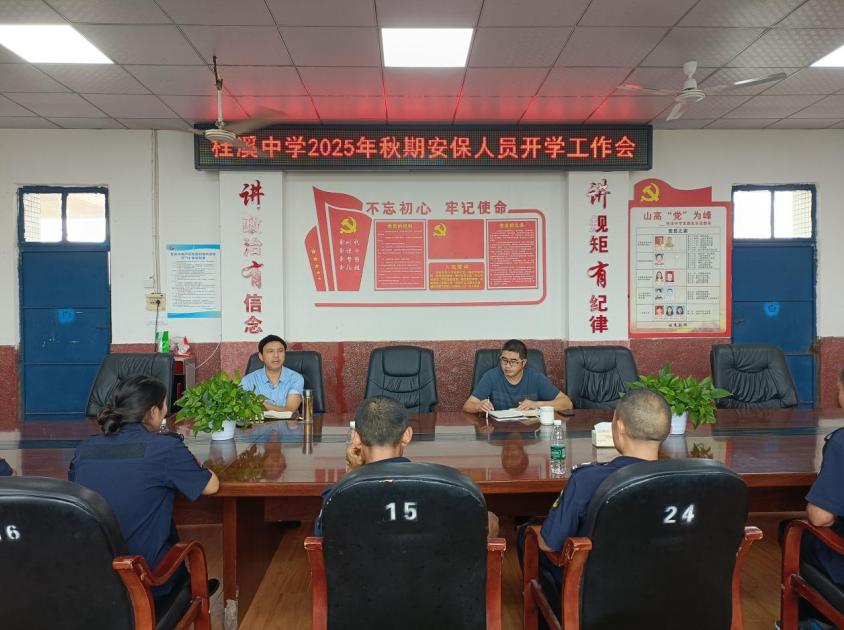 为进一步提升安保人员安全意识,紧绷安全之弦,确保学校开学工作顺利进行,8月23日,宜宾市南溪区桂溪初级中学校开展了2025年秋期安保人员开学安全工作培训。学校分管安全副校长郭邦权、安保处主任黄保猛及学校安保人员参加会议。