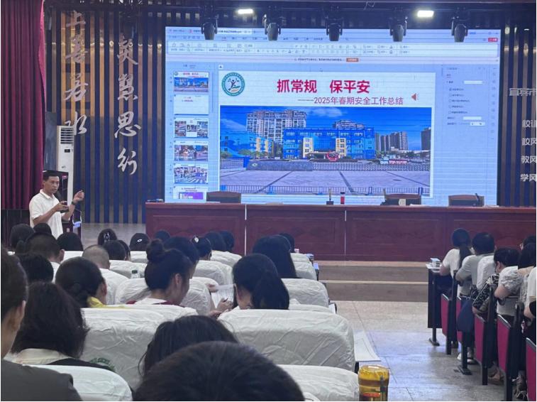 会议最后,杨召云校长对本次开学工作会进行了全面总结。他充分肯定了各科室上学年所取得的成绩,对全体教职员工的辛勤付出表示衷心感谢。同时,他强调新学期是充满机遇和挑战的新起点,全体教职员工要紧密团结在一起,以党建为引领,牢记育人使命,将“干净、担当、忠诚”的品质融入到日常工作的每一个环节。要不断提升自身的专业素养和教育教学能力,积极探索创新教育教学方法,努力为学生提供更加优质、高效的教育服务。