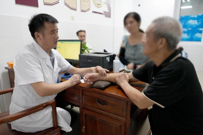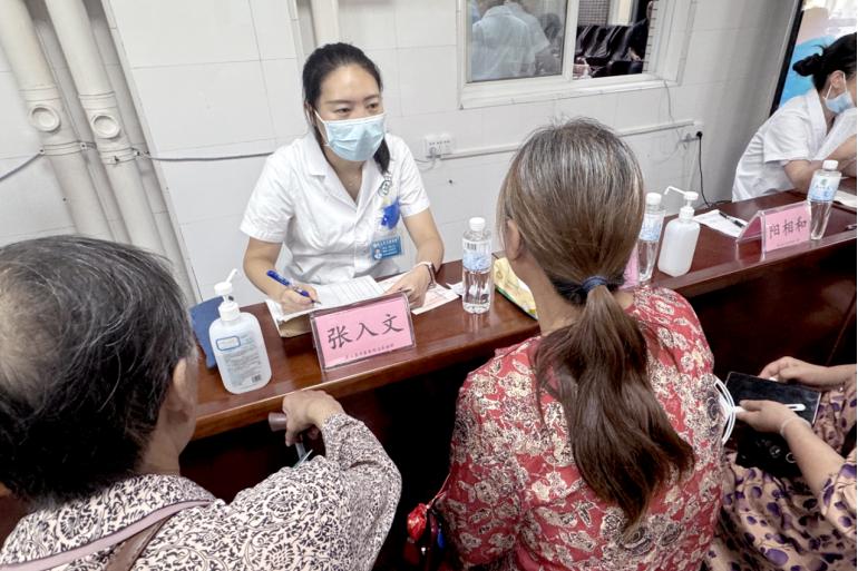 义诊现场,来自针灸推拿科、内一科、外二科、妇产科、皮肤科等科室多名专家医师现场坐诊,医师们通过细致询问患者症状、查看身体状况,为有需要的居民开具处方。