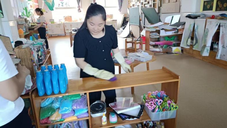 物品深消毒:对幼儿餐具、水杯、毛巾、玩具、图书、床铺、桌面等幼儿高频接触的物品进行了清洗、暴晒及消毒液擦拭或紫外线灯照射消毒,确保卫生安全无死角。
