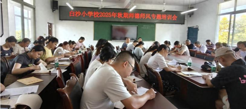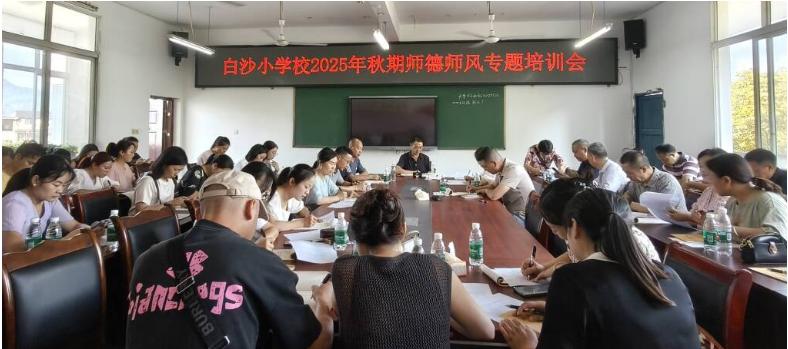 2025年8月29日上午,江安县阳春镇白沙小学校在学校会议室,利用暑期教师集中研修的时间开展了师德师风专题培训活动。整个活动由学校党支部书记、校长朱平主持,学校63名教师参加了本次专题活动。
